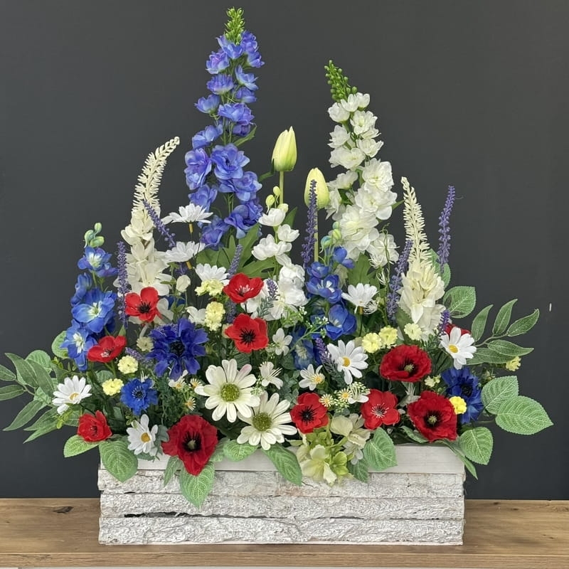 Wiosenna kompozycja ogródek ostróżki polne kwiaty donica drewno Estera XL wz.3