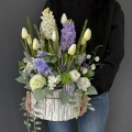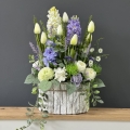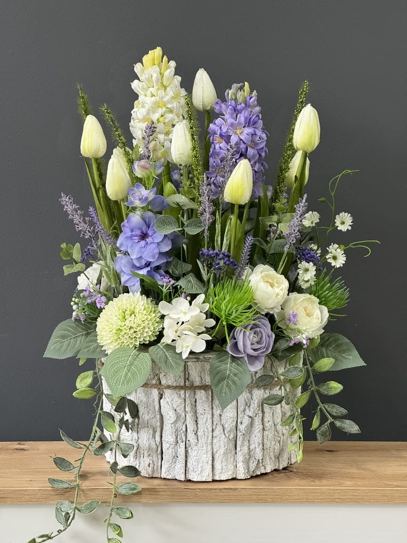 Oryginalna kompozycja roślinna, wykonana z miksu wiosennych kwiatów i zielonych dodatków. Całość została osadzona w drewnianej donicy obciążonej cementem i pokrytej korą. Kompozycja ma wiele uroku i uniwersalne zastosowanie. Sprawdzi się zarówno jako wiosenna kompozycja nagrobna, jak również jako dekoracja do domu, na taras czy do ogrodu. Jest dość ciężka i stabilna. Ze względu na celowe postarzenia donicy, przypomina styl rustykalny.