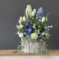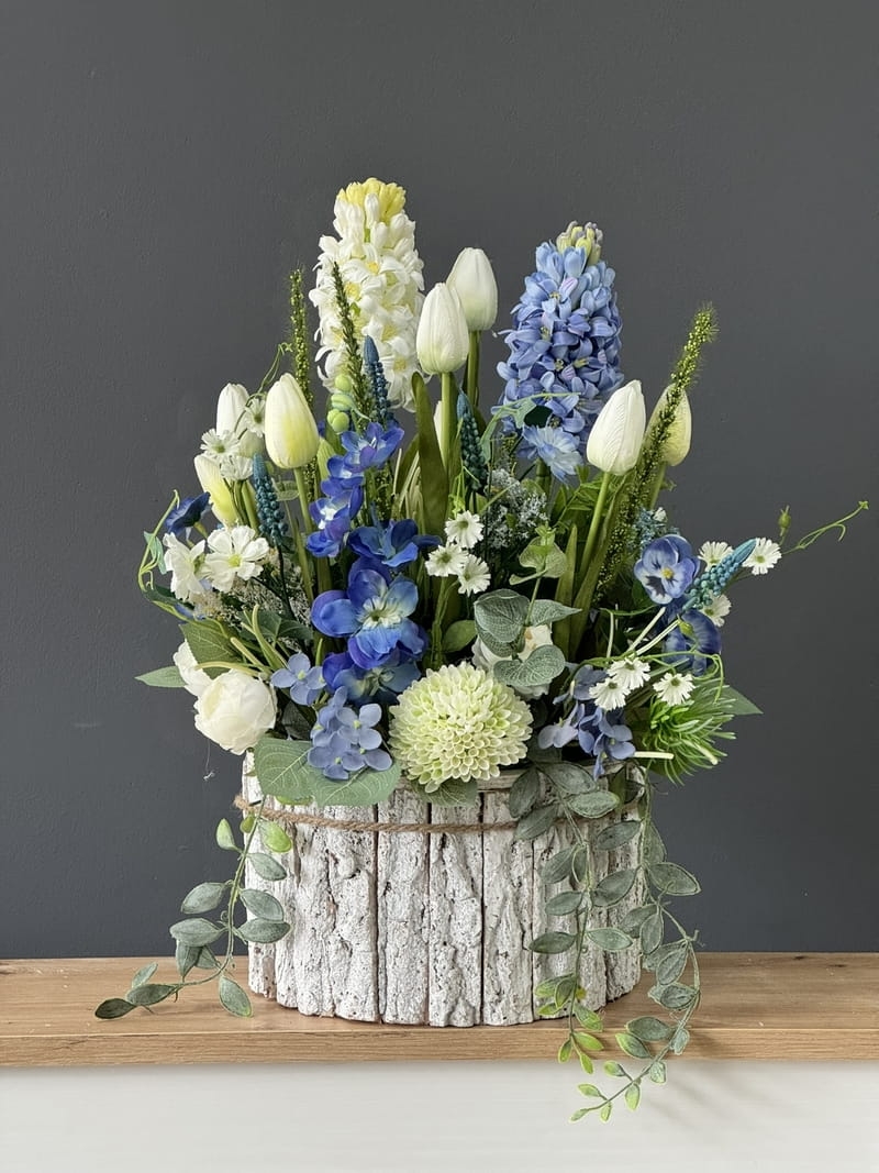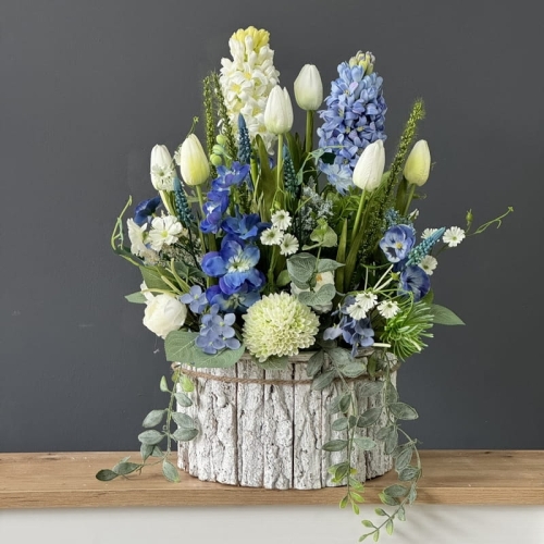 Oryginalna kompozycja roślinna, wykonana z miksu wiosennych kwiatów i zielonych dodatków. Całość została osadzona w drewnianej donicy obciążonej cementem i pokrytej korą. Kompozycja ma wiele uroku i uniwersalne zastosowanie. Sprawdzi się zarówno jako wiosenna kompozycja nagrobna, jak również jako dekoracja do domu, na taras czy do ogrodu. Jest dość ciężka i stabilna. Ze względu na celowe postarzenia donicy, przypomina styl rustykalny.