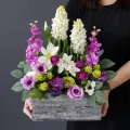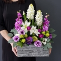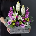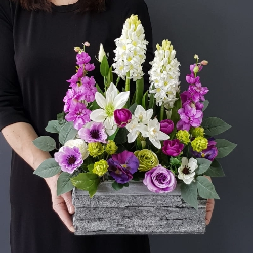 Oryginalna kompozycja roślinna, wykonana z miksu wiosennych kwiatów i zielonych dodatków. Całość została osadzona w drewnianej donicy obciążonej cementem i pokrytej korą. Kompozycja ma wiele uroku i uniwersalne zastosowanie. Sprawdzi się zarówno jako wiosenna kompozycja nagrobna, jak również jako dekoracja do domu, na taras czy do ogrodu. Jest dość ciężka i stabilna. Ze względu na celowe postarzenia donicy, przypomina styl rustykalny.