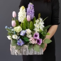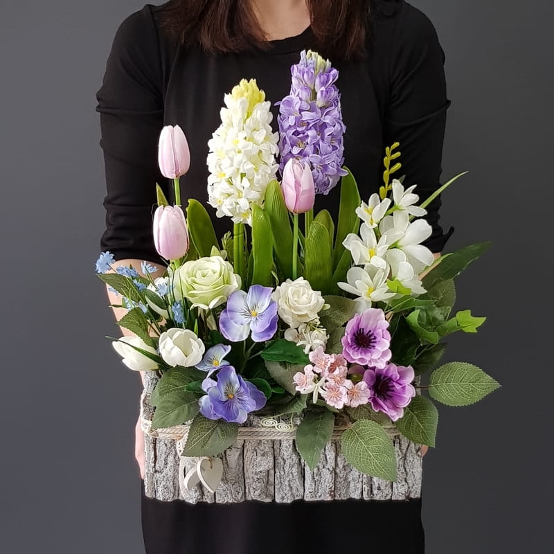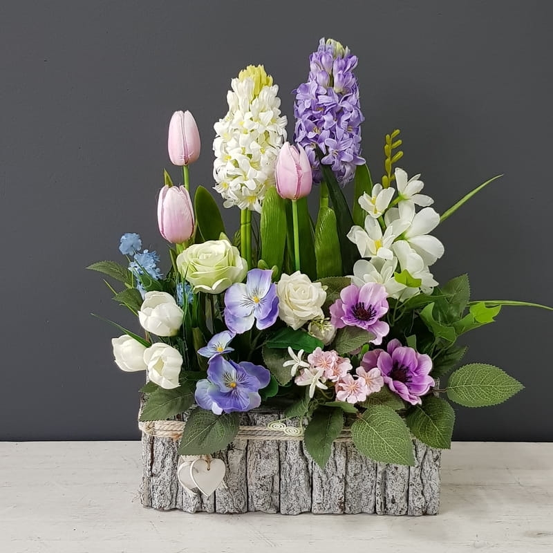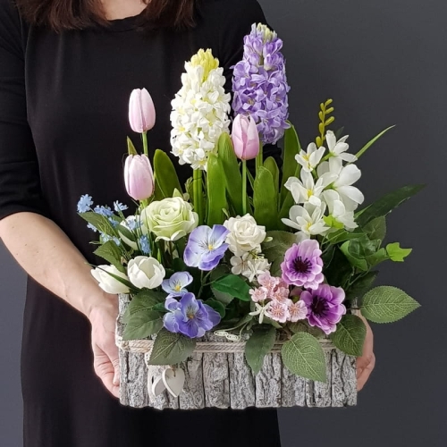 Oryginalna kompozycja roślinna, wykonana z miksu wiosennych kwiatów i zielonych dodatków. Całość została osadzona w drewnianej donicy obciążonej cementem i pokrytej korą. Kompozycja ma wiele uroku i uniwersalne zastosowanie. Sprawdzi się zarówno jako wiosenna kompozycja nagrobna, jak również jako dekoracja do domu, na taras czy do ogrodu. Jest dość ciężka i stabilna. Ze względu na celowe postarzenia donicy, przypomina styl rustykalny.