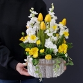 Wiosenna kompozycja ogródek tulipany donica z kory Terra żółta