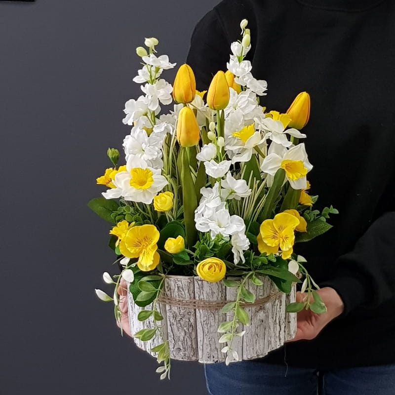Oryginalna kompozycja roślinna, wykonana z miksu wiosennych kwiatów i zielonych dodatków. Całość została osadzona w drewnianej donicy obciążonej cementem i pokrytej korą. Kompozycja ma wiele uroku i uniwersalne zastosowanie. Sprawdzi się zarówno jako wiosenna kompozycja nagrobna, jak również jako dekoracja do domu, na taras czy do ogrodu. Jest dość ciężka i stabilna. Ze względu na celowe postarzenia donicy, przypomina styl rustykalny.