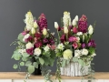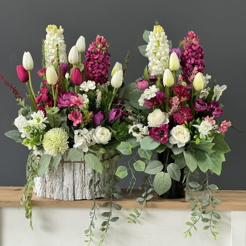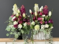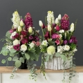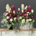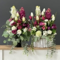 Oryginalna kompozycja roślinna, wykonana z miksu wiosennych kwiatów i zielonych dodatków. Całość została osadzona w drewnianej donicy obciążonej cementem i pokrytej korą. Kompozycja ma wiele uroku i uniwersalne zastosowanie. Sprawdzi się zarówno jako wiosenna kompozycja nagrobna, jak również jako dekoracja do domu, na taras czy do ogrodu. Jest dość ciężka i stabilna. Ze względu na celowe postarzenia donicy, przypomina styl rustykalny.