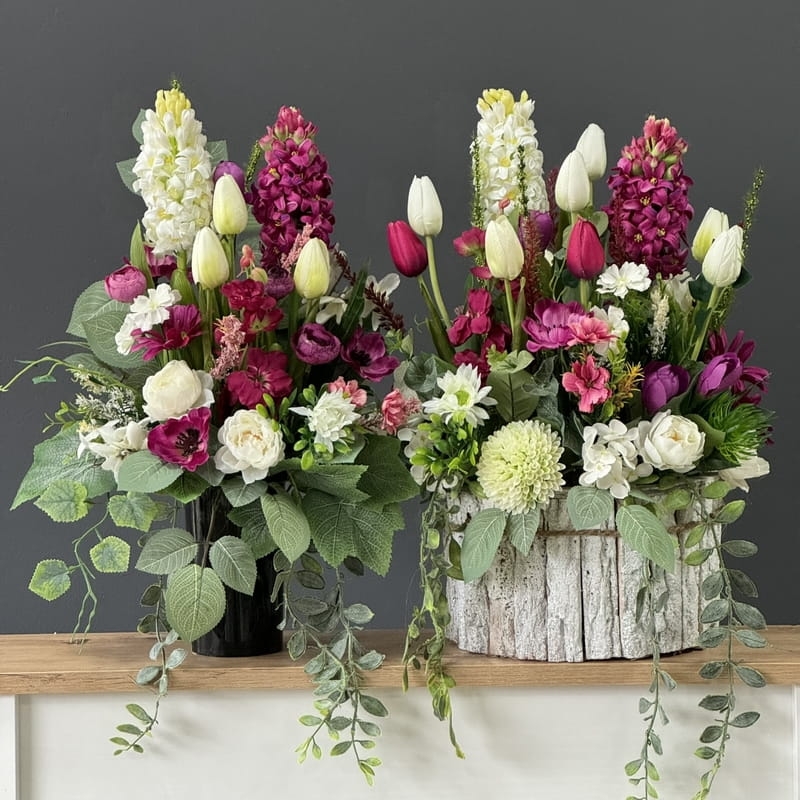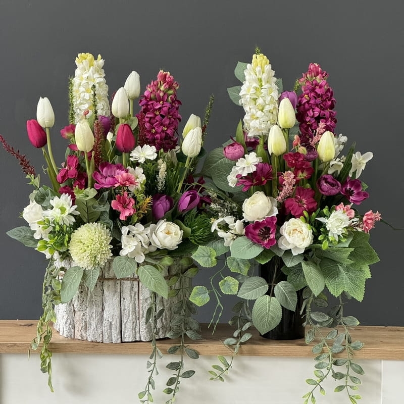 Piękna i oryginalna dekoracja wykonana w naszej pracowni w Toruniu. Wszystkie kompozycje wykonujemy ręcznie, dlatego poszczególne egzemplarze mogą się minimalnie od siebie różnić rodzajem lub układem kwiatów. Wszystkie jednak są wykonane z dbałością o najdrobniejsze szczegóły i zachowaniem kolorystyki.
