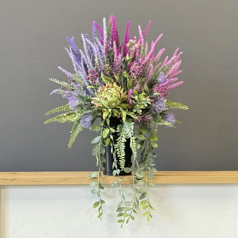 Oryginalna kompozycja nagrobna w postaci bukietu do wazonu umieszczona w obciążonym wkładzie pasującym do większości nagrobnych wazonów, wykonana z wysokiej jakości roślin sztucznych w letnich kolorach.