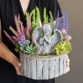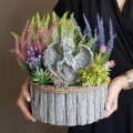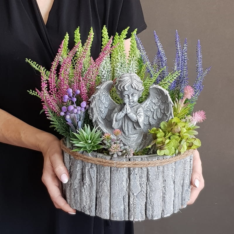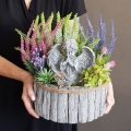 Dekoracja funeralna z wrzosami osadzona w drewnianej donicy obłożonej korą. Postawa jest obciążona cementem, wypełniona dużą ilością kwiatów, liści i roślinnych dodatków w przepięknej, stonowanej kolorystyce. Szczególnego uroku dodaje jej przepiękny anioł umieszczony w kompozycji.