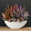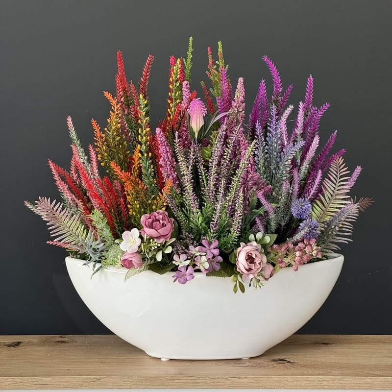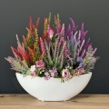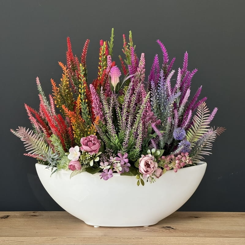 Sztuczne wrzosy osadzone w ceramicznej donicy to stylowa i trwała dekoracja. Nasza propozycja to połączenie różnych kolorów wrzosów w jednej donicy, uzupełnionych jesiennymi dodatkami. Piękne, energetyczne zestawienie kolorów i faktur. Podłużna donica doskonale współgra z naturalnym wyglądem sztucznych wrzosów, co stanowi harmonijne połączenie. Doskonale sprawdzają się jako element dekoracyjny, zarówno wewnątrz, jak i na zewnątrz pomieszczeń. Ich wyjątkowy urok i różnorodność kolorów stanowią cenne walory estetyczne dla każdego miejsca, w którym są umieszczone. Poszczególne kompozycje minimalnie mogą się różnić rozkładem i rodzajami kwiatów, w zależności od dostępności, jednak kolorystyka i wizualny efekt końcowy są zawsze zachowane.