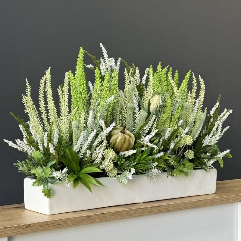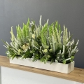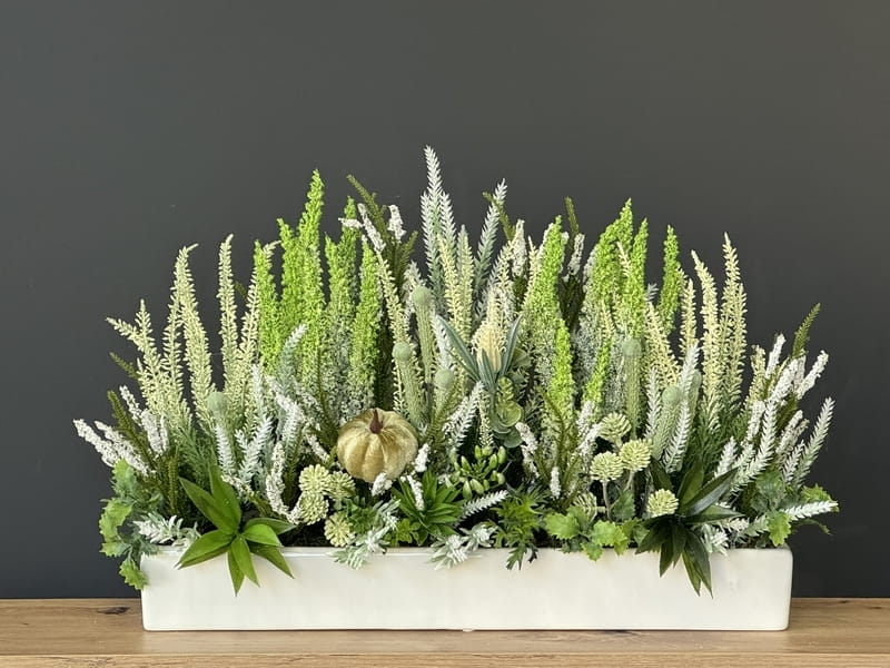 Sztuczne wrzosy w ceramicznej donicy to stylowa i trwała dekoracja. Takie kompozycje dodają industrialnego uroku i charakteru zarówno wnętrzom, jak i otoczeniu na zewnątrz. Biała donica doskonale współgra z naturalnym wyglądem sztucznych wrzosów, co tworzy harmonijną i nowoczesną estetykę.