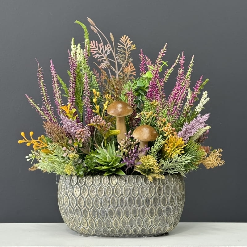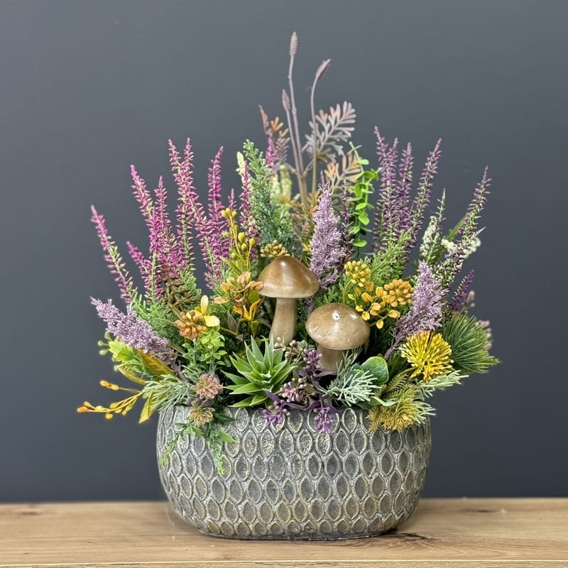Sztuczne wrzosy osadzone w ceramicznej donicy to stylowa i trwała dekoracja. Nasza propozycja to połączenie różnych kolorów wrzosów w jednej donicy, uzupełnionych jesiennymi dodatkami. Piękne, energetyczne zestawienie kolorów i faktur. Oryginalna, ceramiczna donica w stonowanej kolorystyce doskonale współgra z naturalnym wyglądem sztucznych wrzosów, co stanowi niezwykle harmonijne połączenie. Doskonale sprawdzają się jako element dekoracyjny, zarówno wewnątrz, jak i na zewnątrz pomieszczeń. Ich wyjątkowy urok i różnorodność kolorów stanowią cenne walory estetyczne dla każdego miejsca, w którym są umieszczone. Poszczególne kompozycje minimalnie mogą się różnić rozkładem i rodzajami kwiatów, w zależności od dostępności, jednak kolorystyka i wizualny efekt końcowy są zawsze zachowane.