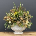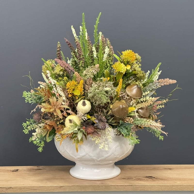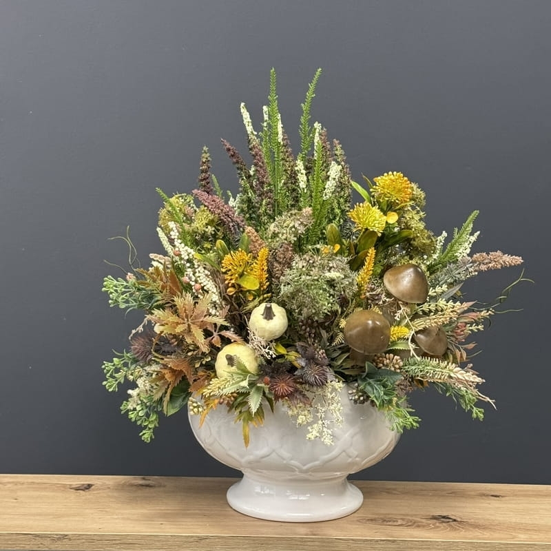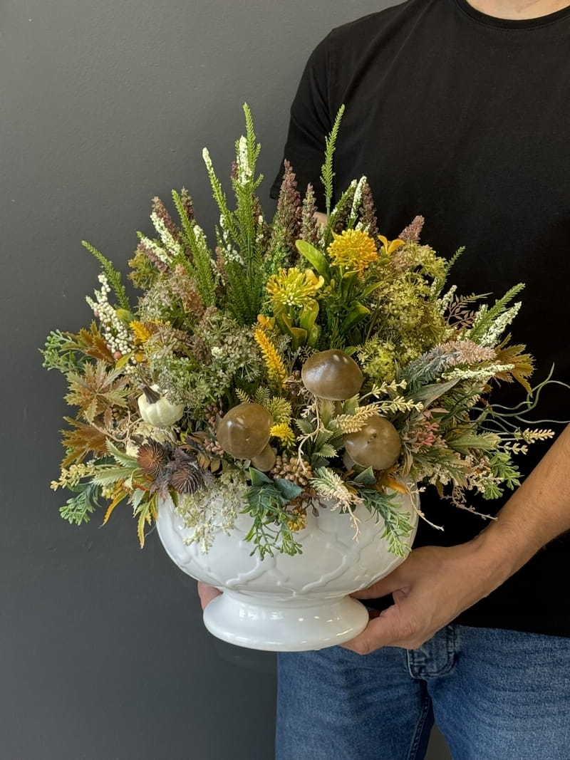 Sztuczne wrzosy osadzone w ceramicznej donicy to stylowa i trwała dekoracja. Nasza propozycja to połączenie różnych kolorów wrzosów w jednej donicy, uzupełnionych jesiennymi dodatkami. Piękne, energetyczne zestawienie kolorów i faktur. Oryginalna, ceramiczna donica w stonowanej kolorystyce doskonale współgra z naturalnym wyglądem sztucznych wrzosów, co stanowi niezwykle harmonijne połączenie. Doskonale sprawdzają się jako element dekoracyjny, zarówno wewnątrz, jak i na zewnątrz pomieszczeń. Ich wyjątkowy urok i różnorodność kolorów stanowią cenne walory estetyczne dla każdego miejsca, w którym są umieszczone. Poszczególne kompozycje minimalnie mogą się różnić rozkładem i rodzajami kwiatów, w zależności od dostępności, jednak kolorystyka i wizualny efekt końcowy są zawsze zachowane.