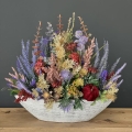 Sztuczne wrzosy osadzone w ceramicznej donicy to stylowa i trwała dekoracja. Nasza propozycja to połączenie różnych kolorów wrzosów w jednej donicy, uzupełnionych jesiennymi dodatkami. Piękne, energetyczne zestawienie kolorów i faktur. Podłużna donica doskonale współgra z naturalnym wyglądem sztucznych wrzosów, co stanowi harmonijne połączenie. Doskonale sprawdzają się jako element dekoracyjny, zarówno wewnątrz, jak i na zewnątrz pomieszczeń. Ich wyjątkowy urok i różnorodność kolorów stanowią cenne walory estetyczne dla każdego miejsca, w którym są umieszczone. Poszczególne kompozycje minimalnie mogą się różnić rozkładem i rodzajami kwiatów, w zależności od dostępności, jednak kolorystyka i wizualny efekt końcowy są zawsze zachowane.