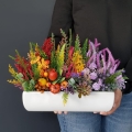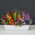Sztuczne wrzosy osadzone w ceramicznej donicy to stylowa i trwała dekoracja. Nasza propozycja to połączenie różnych kolorów wrzosów w jednej donicy, uzupełnionych jesiennymi dodatkami. Piękne, energetyczne zestawienie kolorów i faktur. Podłużna donica doskonale współgra z naturalnym wyglądem sztucznych wrzosów, co stanowi harmonijne połączenie. Doskonale sprawdzają się jako element dekoracyjny, zarówno wewnątrz, jak i na zewnątrz pomieszczeń. Ich wyjątkowy urok i różnorodność kolorów stanowią cenne walory estetyczne dla każdego miejsca, w którym są umieszczone. Poszczególne kompozycje minimalnie mogą się różnić rozkładem i rodzajami kwiatów, w zależności od dostępności, jednak kolorystyka i wizualny efekt końcowy są zawsze zachowane.