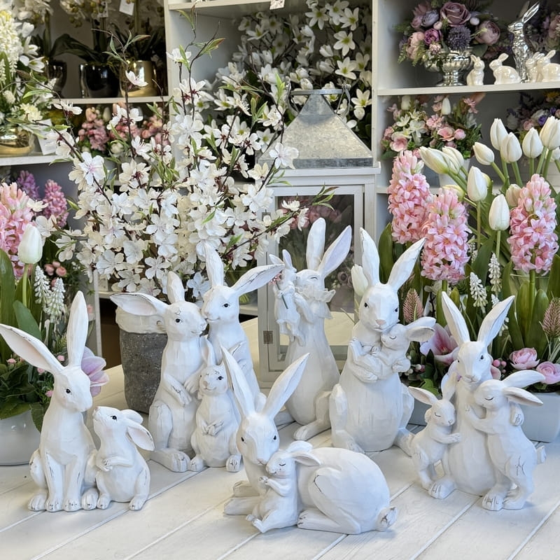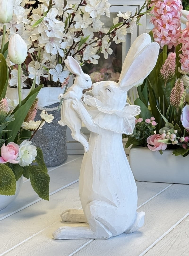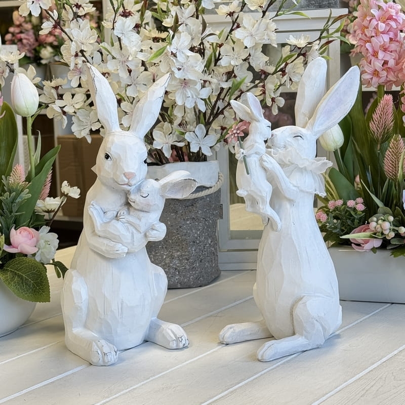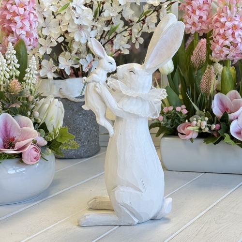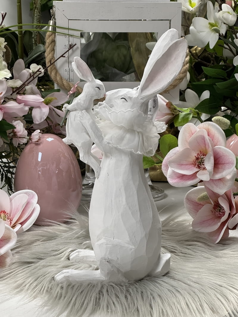 Figurka przedstawiająca parę białych zajączków wykonanych z poliresingu zachwyca urokiem i subtelnym stylem antique. Powierzchnia figurki została ozdobiona delikatnymi postarzeniami, takimi jak drobne przetarcia czy nieregularności, które nadają jej wrażenie vintage i wyjątkowego charakteru. Zajączki ukazane są w słodkiej, pełnej czułości pozie, co dodaje dekoracji wdzięku i przytulności. Detale, takie jak subtelnie zarysowane futerko czy proporcjonalne kształty, zostały wykonane z dużą precyzją. Figurka idealnie wpasowuje się w aranżacje w stylu rustykalnym, shabby chic czy klasycznym, wprowadzając do wnętrza ciepłą i nostalgicznie uroczą atmosferę. Stanowi doskonałą ozdobę na półkę, komodę lub stolik, a także świetny pomysł na prezent.