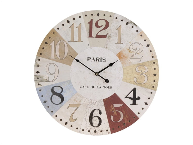 Stylowy, duży zegar z płyty mdf o średnicy 60 cm przeznaczony do powieszenia. Posiada elektroniczny mechanizm zasilany jedną baterią AA (brak w zestawie). Oryginalny motyw dekoracyjny w stylu retro sprawi, że każde wnętrze nabierze wyjątkowego charakteru. Szczególnie dobrze będzie się prezentował we wnętrzach w stylu prowansalskim. Polecam jako doskonały pomysł na prezent.