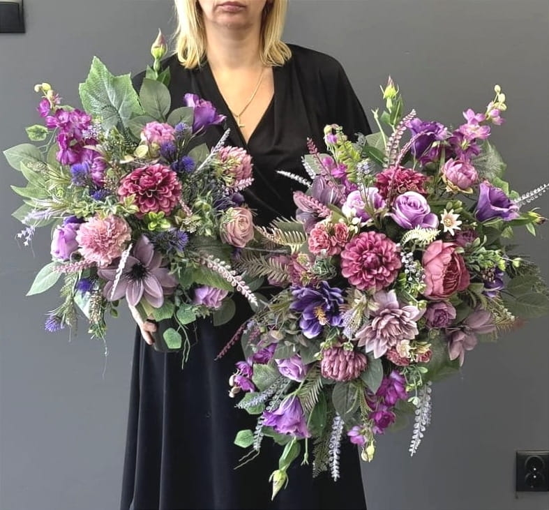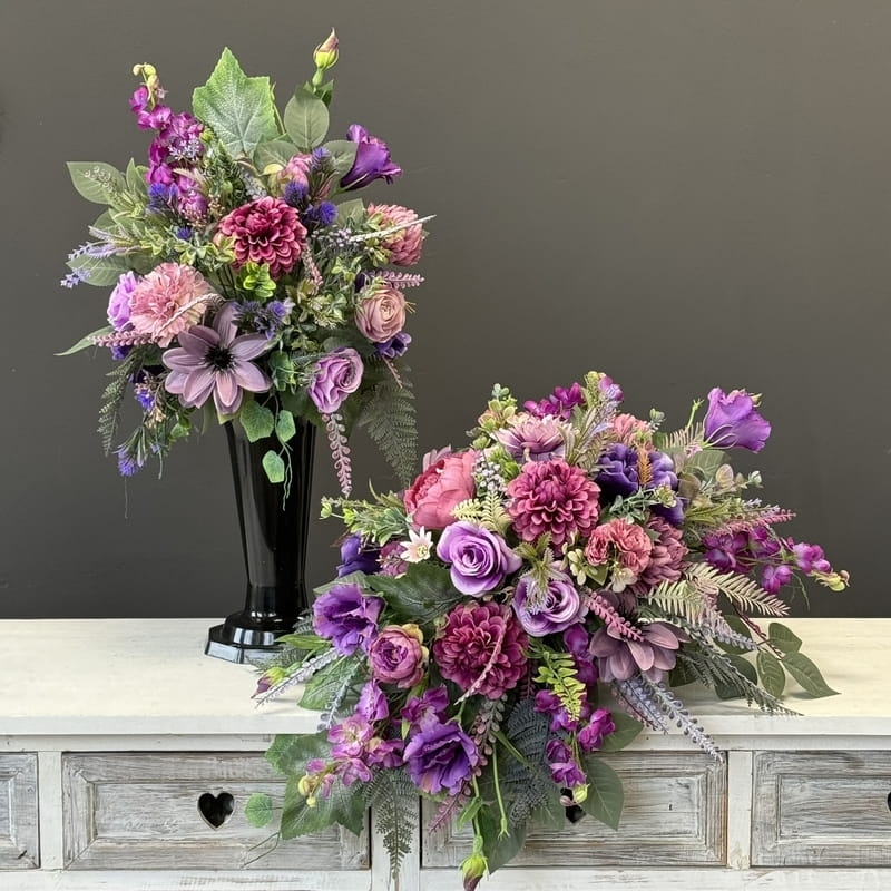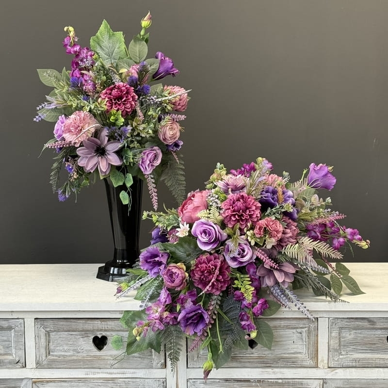 Zestaw kompozycji nagrobnych, na który składa się oryginalna kompozycja nagrobna obustronnie wydłużona oraz luźny bukiet o nieregularnym kształcie wykonane z wysokiej jakości roślin sztucznych w zgaszonych kolorach.
