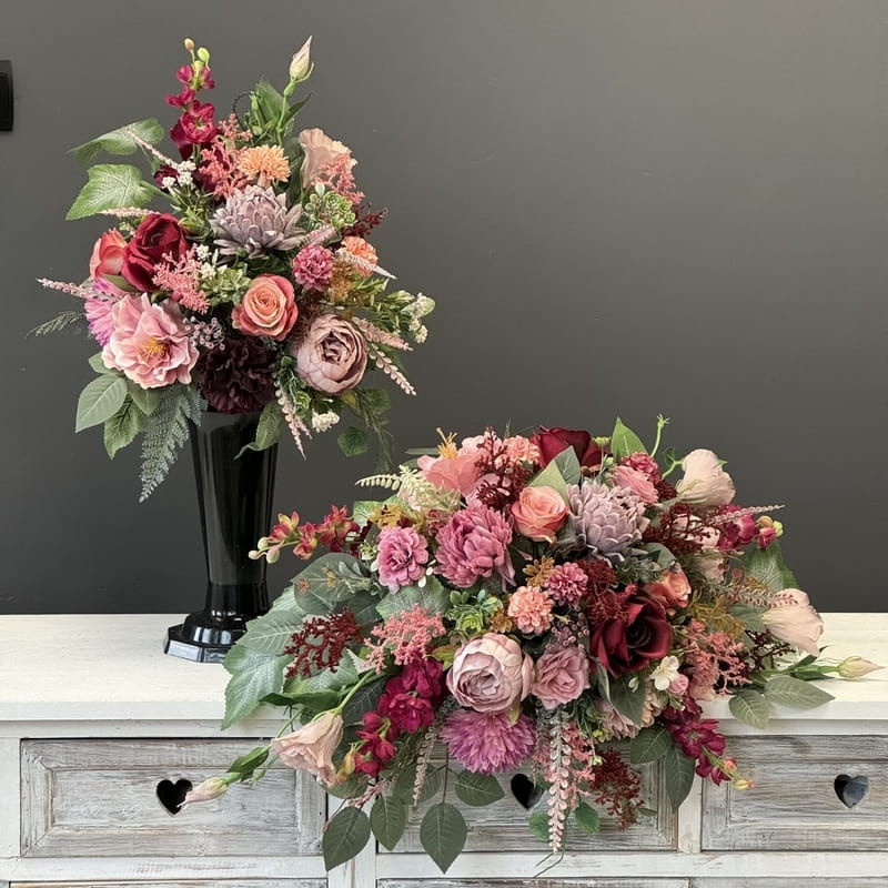 Zestaw kompozycji nagrobnych, na który składa się oryginalna kompozycja nagrobna obustronnie wydłużona oraz luźny bukiet o nieregularnym kształcie wykonane z wysokiej jakości roślin sztucznych w zgaszonych kolorach.