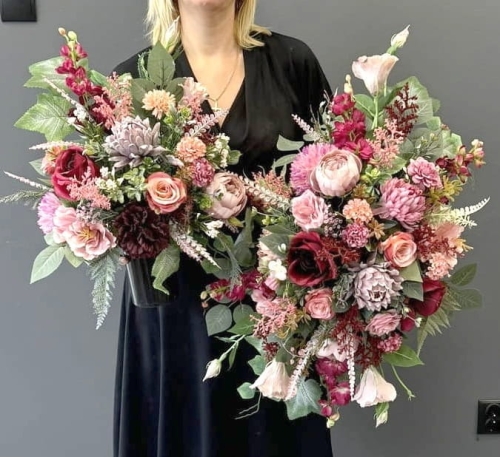 Zestaw kompozycja funeralna wiązanka nagrobna stroik na grób + bukiet Lorena wz.3 amarant