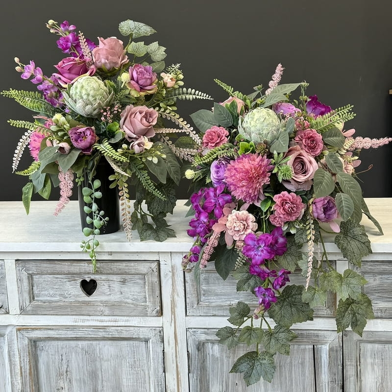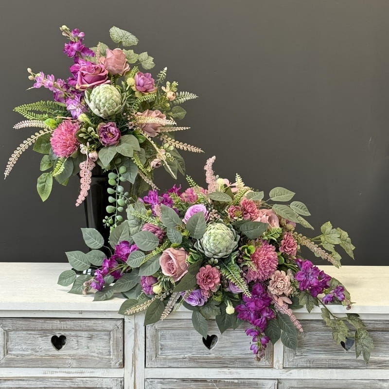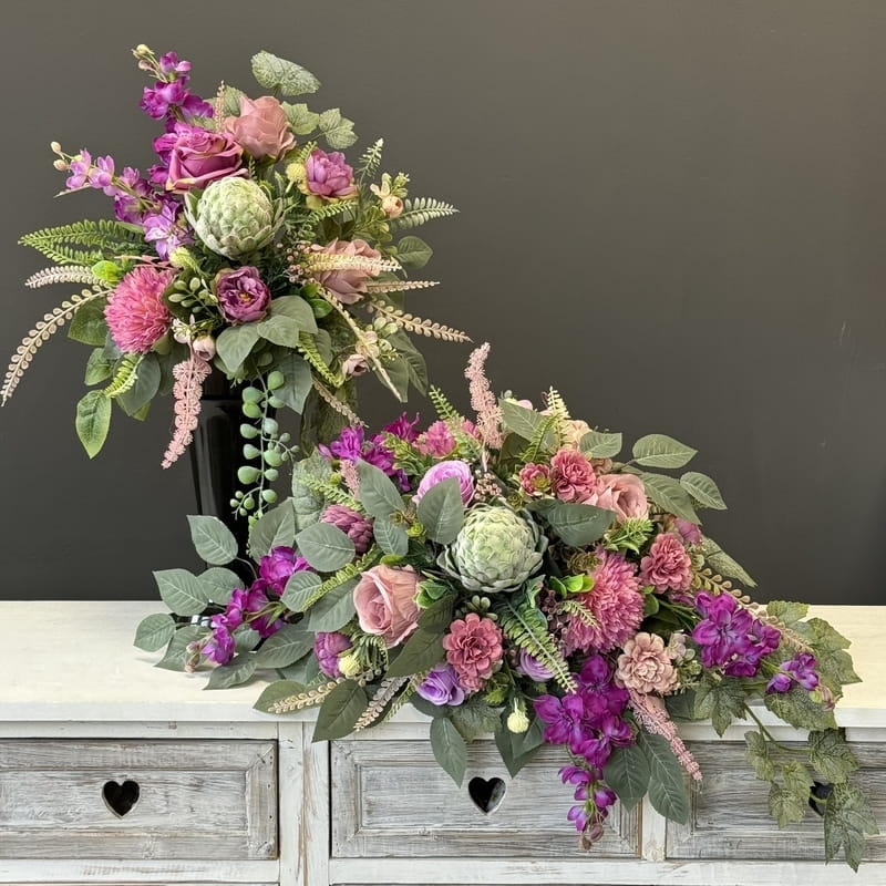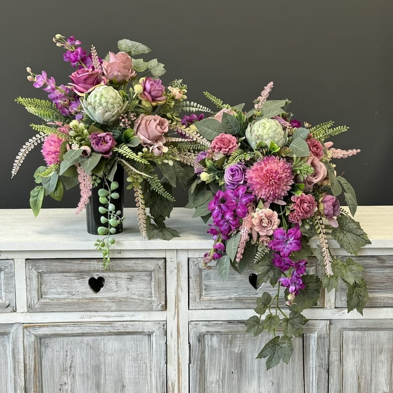 Zestaw kompozycji nagrobnych, na który składa się oryginalna kompozycja nagrobna obustronnie wydłużona oraz luźny bukiet o nieregularnym kształcie wykonane z wysokiej jakości roślin sztucznych w zgaszonych kolorach.