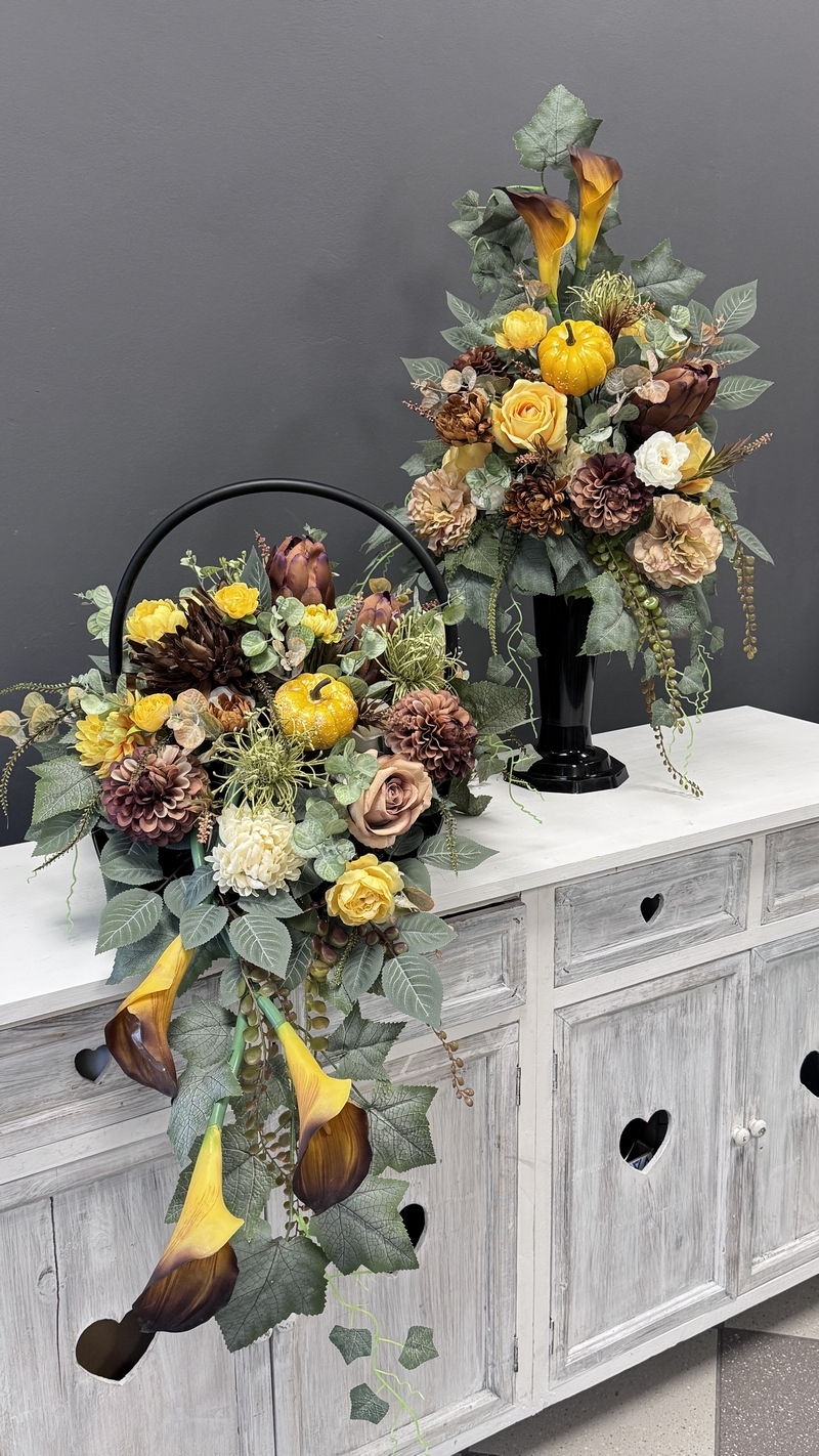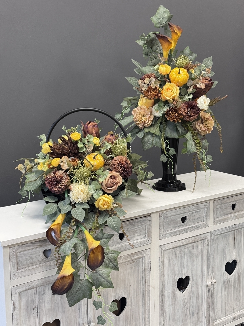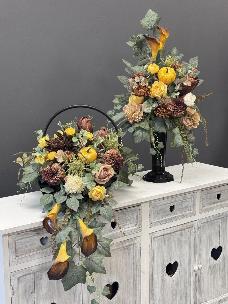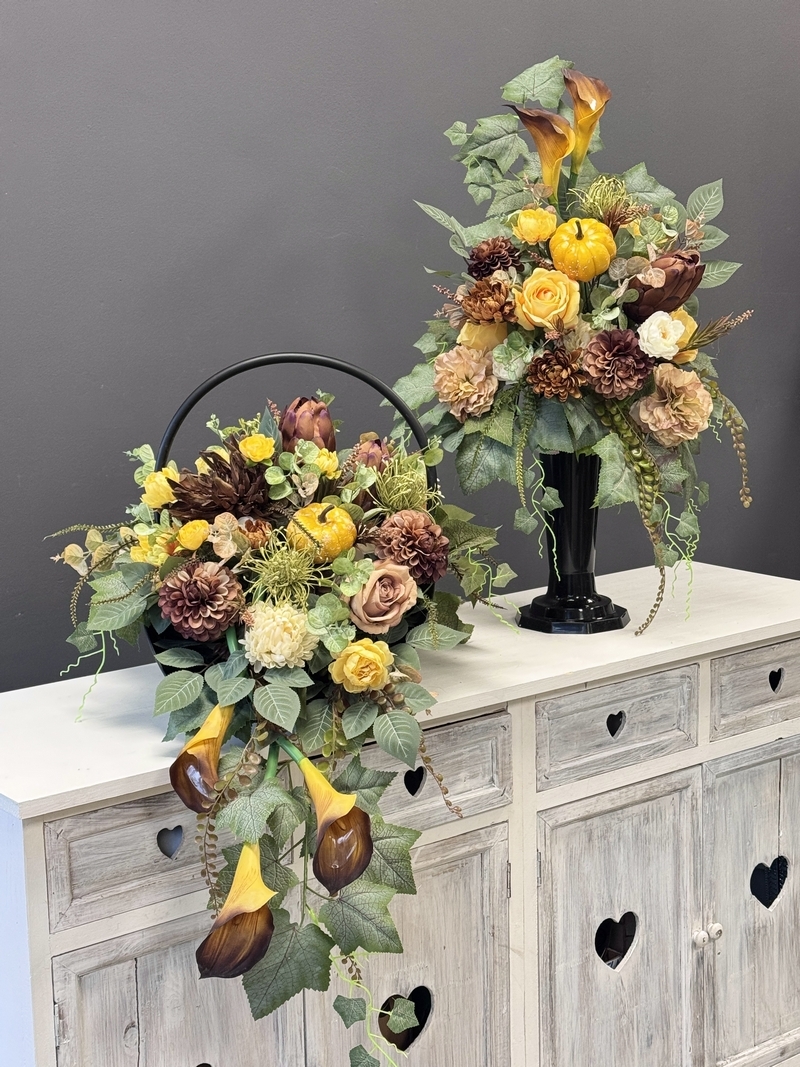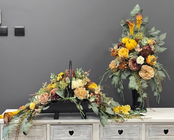 Elegancki komplet na grób składający się z dwóch kompozycji – dekoracji na płytę nagrobną w czarnym metalowym koszu oraz bukietu w osadzonym, obciążonym wkładzie do wazonu. Aranżacje wykonane zostały z wysokiej jakości sztucznych kwiatów w jesiennej kolorystyce. W kompozycji dominują róże, kalie, dalie oraz delikatne dodatki zieleni i pnączy, które nadają całości naturalny i wyjątkowo elegancki charakter.