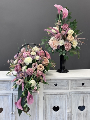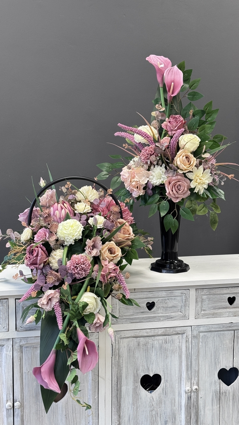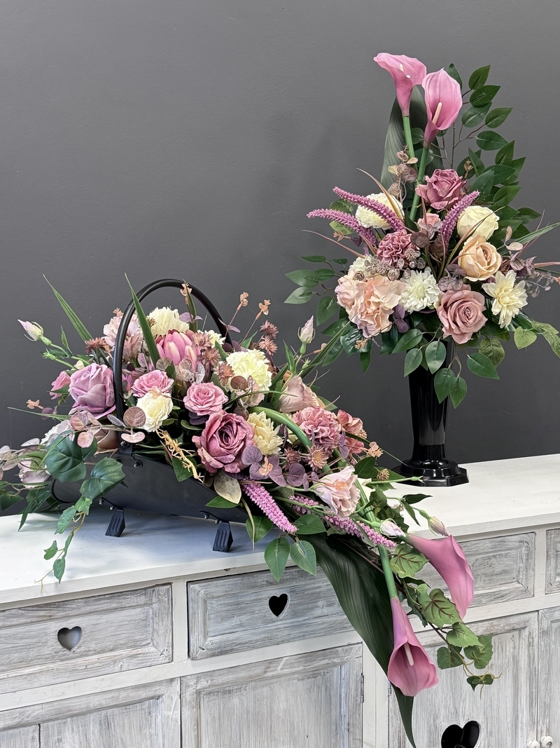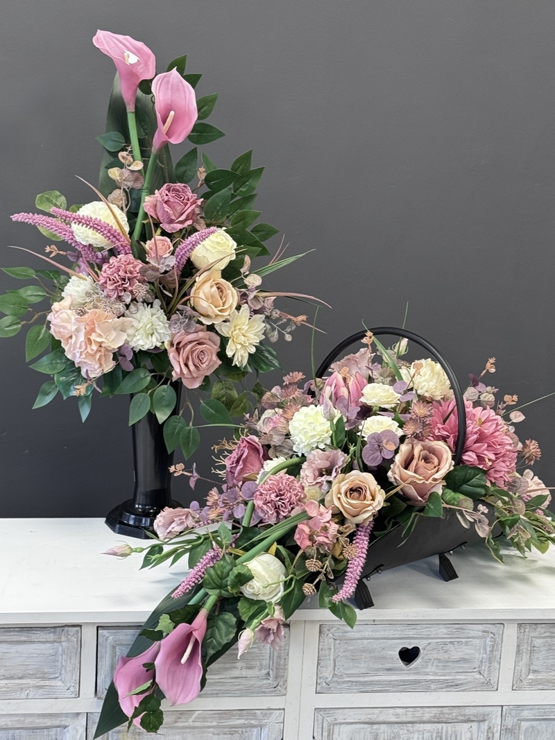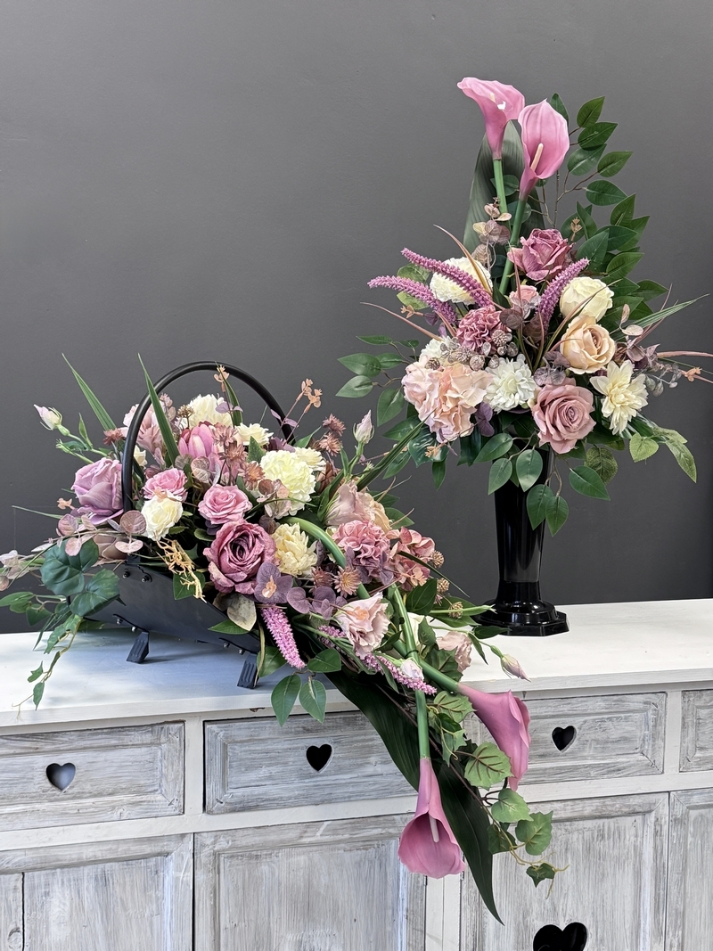 Zestaw kompozycja nagrobna stroik na grób kosz Alva de luxe kalie + bukiet jesienne róże