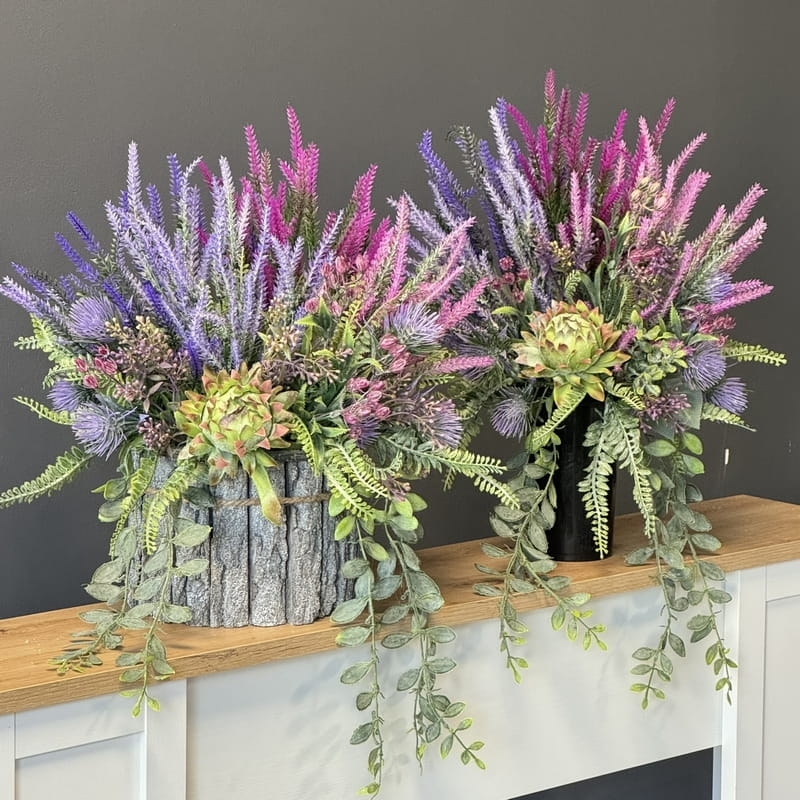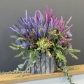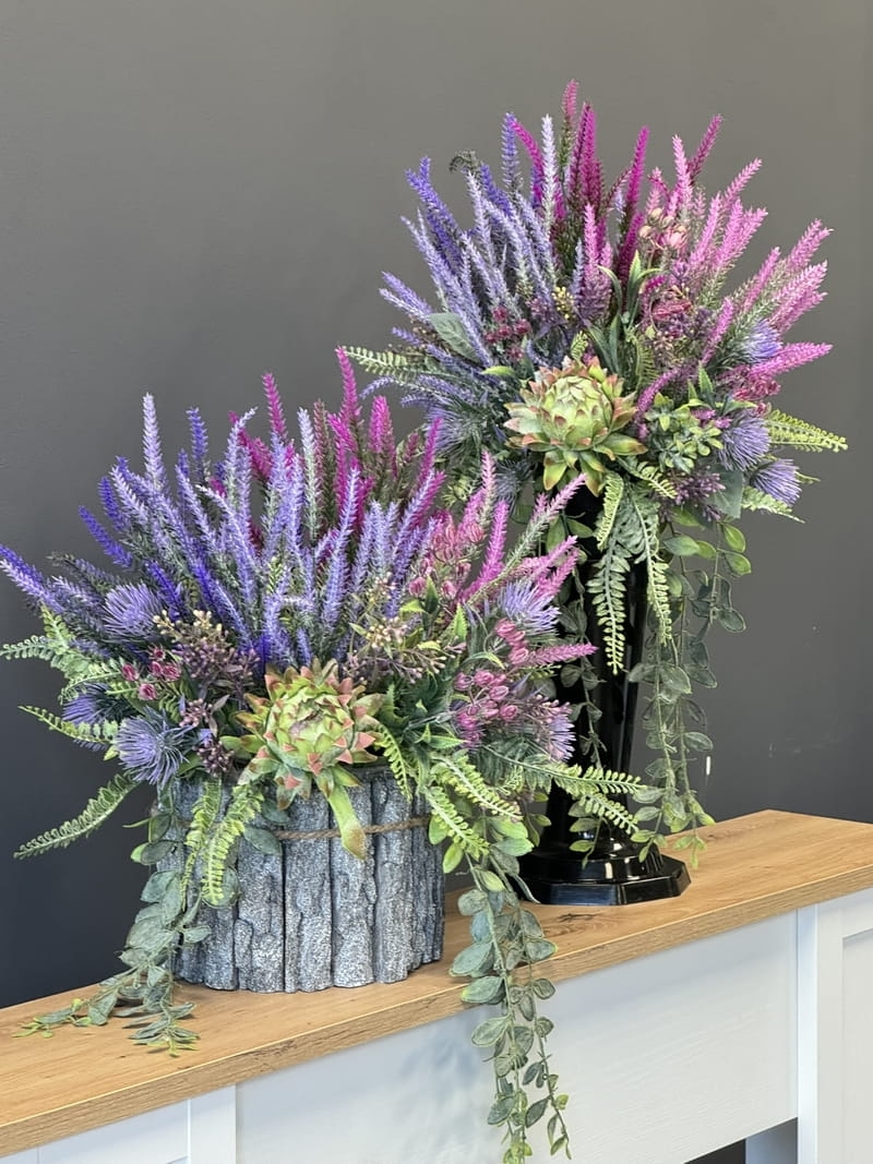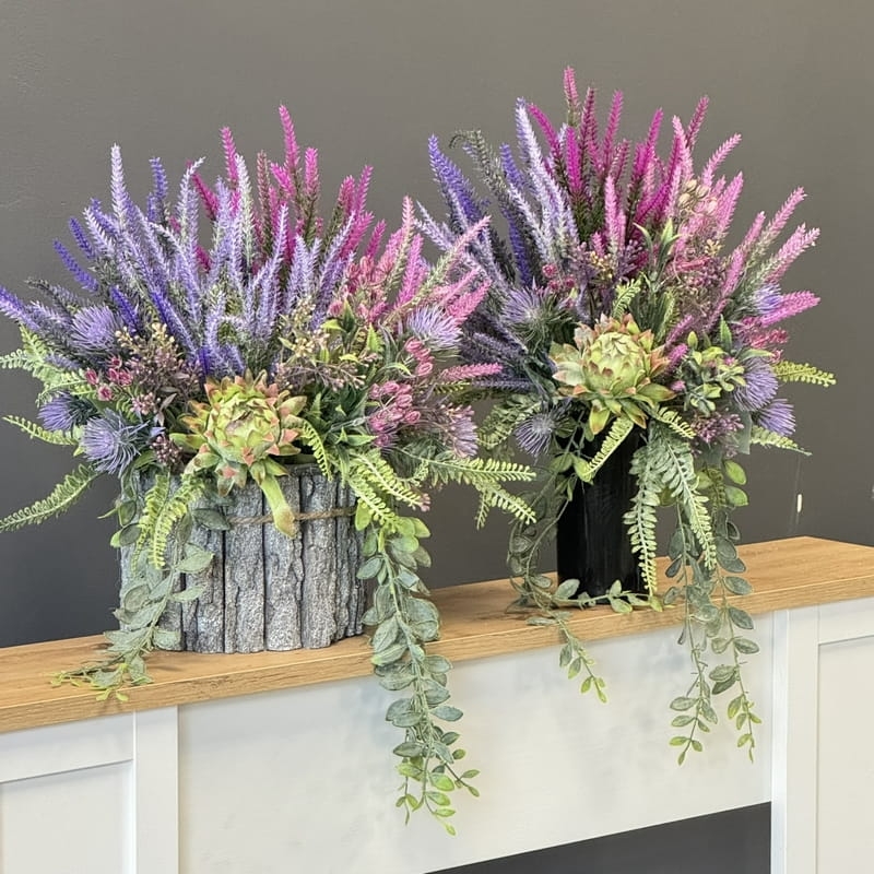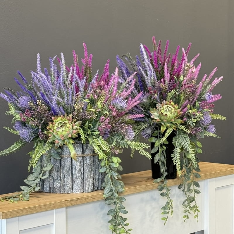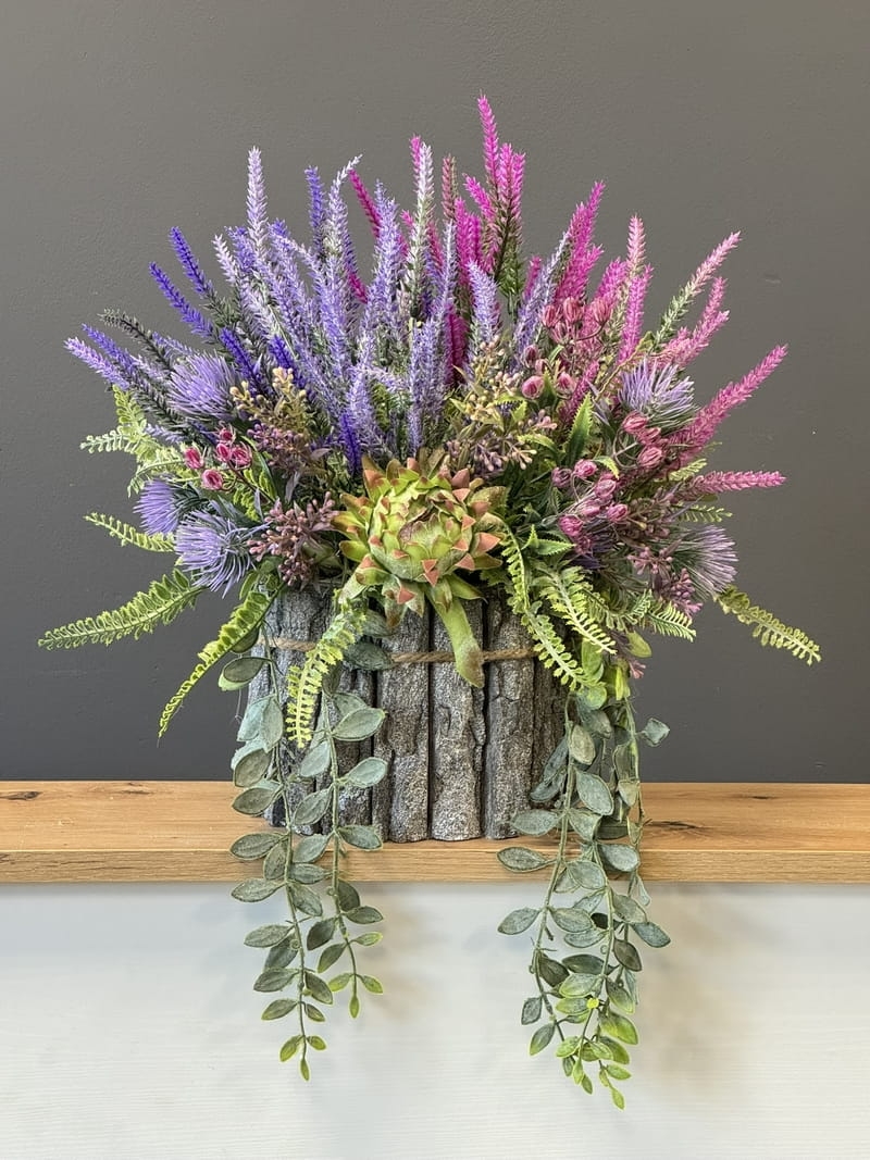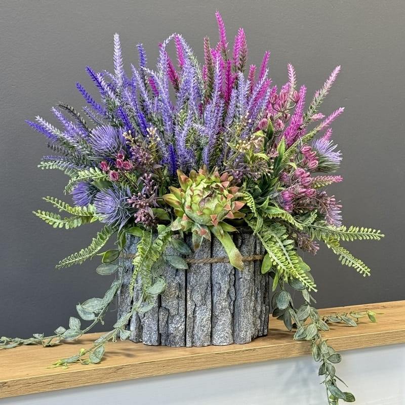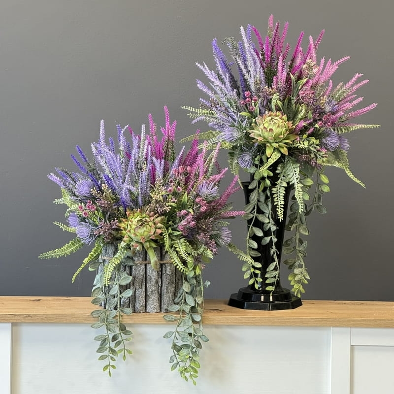 Sztuczne wrzosy osadzone w drewnianej donicy pokrytej fragmentami kory to stylowa i trwała dekoracja. Do kompletu proponujemy bukiet z wrzosów ułożony we wkładzie do wazonu. Oryginalna, drewniana donica dodatkowo obciążona cementem doskonale współgra z naturalnym wyglądem sztucznych wrzosów, co stanowi niezwykle harmonijne połączenie. Doskonale sprawdzają się jako element dekoracyjny, zarówno wewnątrz, jak i na zewnątrz pomieszczeń. Ich wyjątkowy urok i różnorodność kolorów stanowią cenne walory estetyczne dla każdego miejsca, w którym są umieszczone. Często wykorzystywane przez naszych klientów jako kompozycja nagrobna.