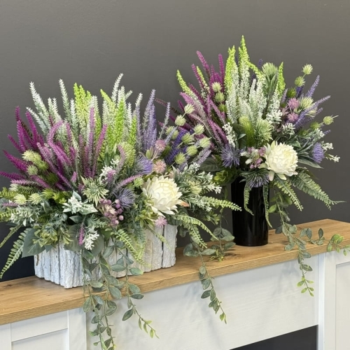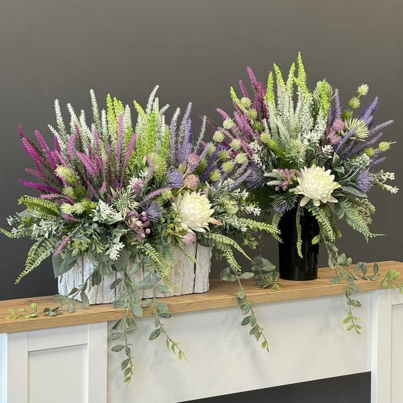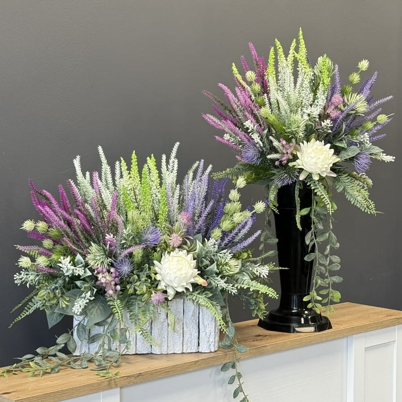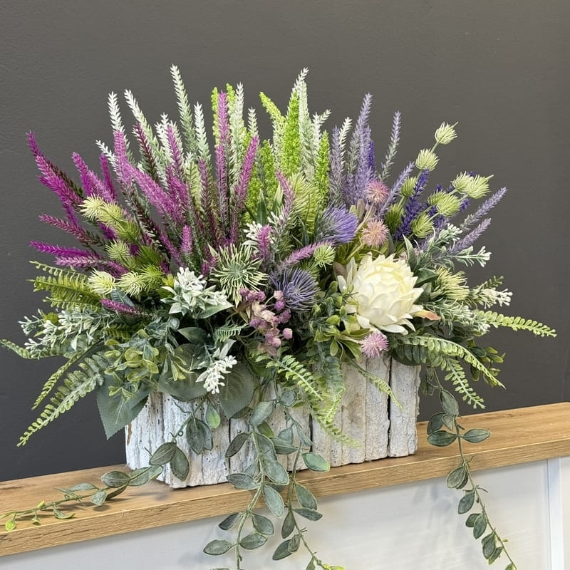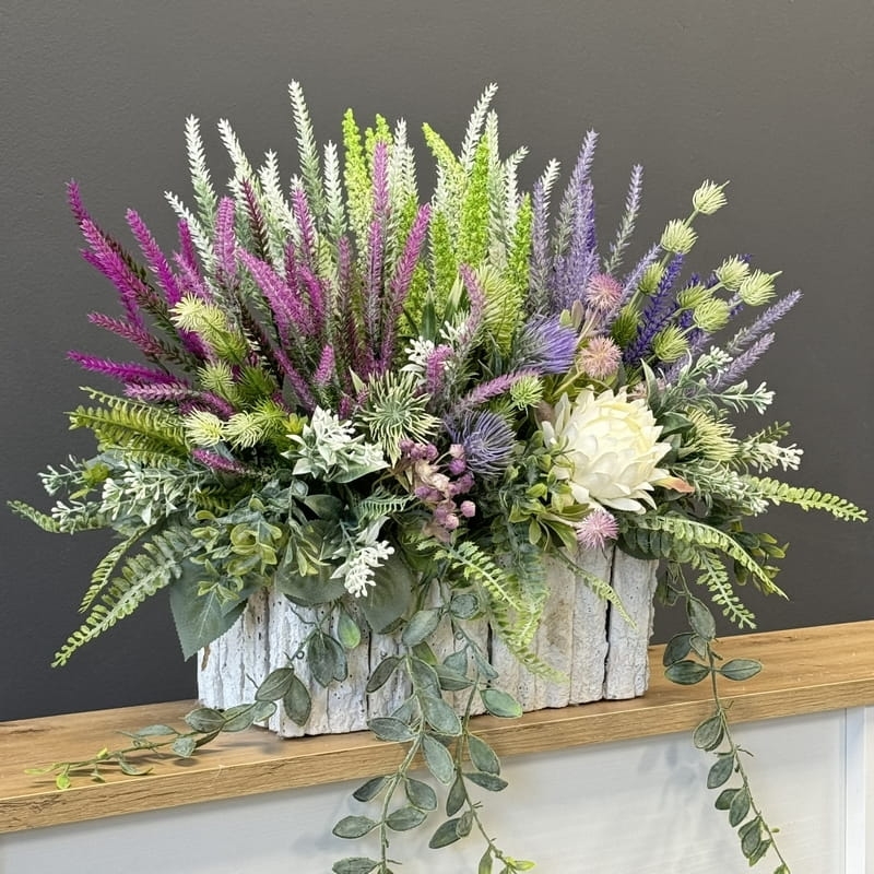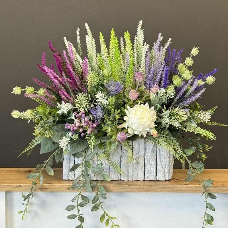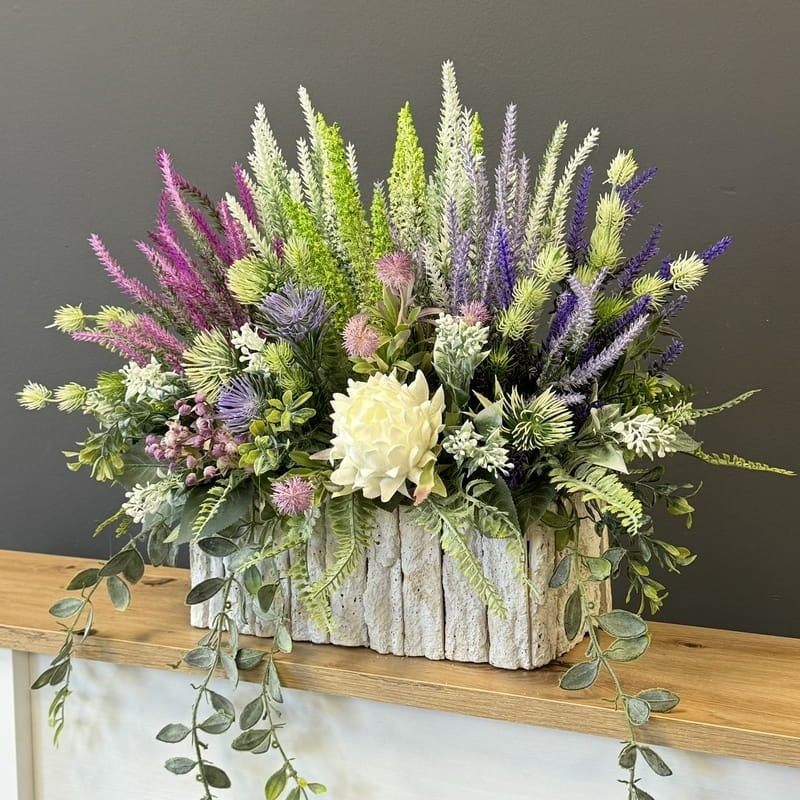 Sztuczne wrzosy osadzone w drewnianej donicy pokrytej fragmentami kory to stylowa i trwała dekoracja. Do kompletu proponujemy bukiet z wrzosów ułożony we wkładzie do wazonu. Oryginalna, drewniana donica dodatkowo obciążona cementem doskonale współgra z naturalnym wyglądem sztucznych wrzosów, co stanowi niezwykle harmonijne połączenie. Doskonale sprawdzają się jako element dekoracyjny, zarówno wewnątrz, jak i na zewnątrz pomieszczeń. Ich wyjątkowy urok i różnorodność kolorów stanowią cenne walory estetyczne dla każdego miejsca, w którym są umieszczone. Często wykorzystywane przez naszych klientów jako kompozycja nagrobna.