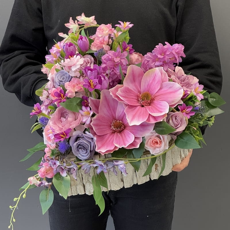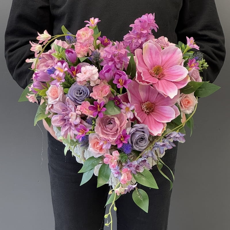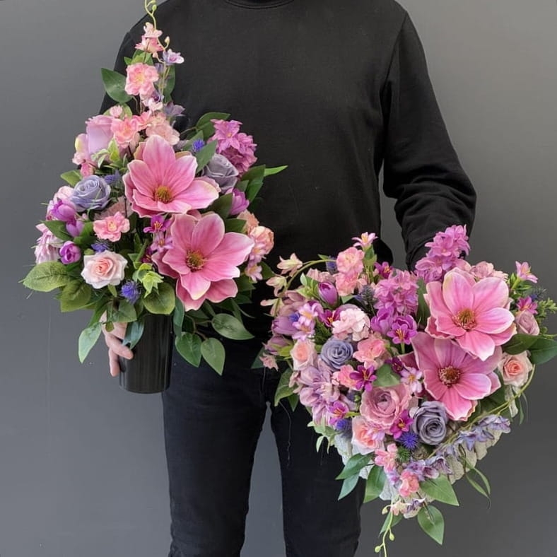 Dekoracja nagrobna w kształcie serca wypełnionego starannie dobranymi wiosennymi kwiatami. W kompozycji dominują okazałe kwiaty magnolii, których delikatne płatki tworzą efekt elegancji i subtelnego piękna. Wśród nich rozmieszczone zostały drobniejsze rośliny sezonowe, dodające aranżacji lekkości i świeżości.
