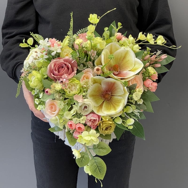 Dekoracja nagrobna w kształcie serca wypełnionego starannie dobranymi wiosennymi kwiatami. W kompozycji dominują okazałe kwiaty magnolii, których delikatne płatki tworzą efekt elegancji i subtelnego piękna. Wśród nich rozmieszczone zostały drobniejsze rośliny sezonowe, dodające aranżacji lekkości i świeżości.