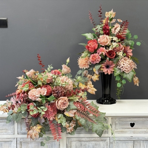 Każdy element zestawu został wykonany ręcznie z wysokiej jakości kwiatów sztucznych o realistycznym wyglądzie. Bukiet umieszczony jest w obciążonym, standardowym wkładzie do wazonu, co zapewnia stabilność nawet przy silniejszym wietrze. Na zdjęciach prezentujemy go w wazonie – wyłącznie w celu pokazania proporcji i wielkości kompozycji.