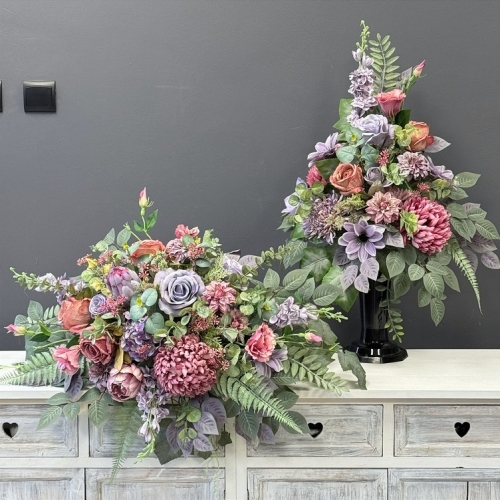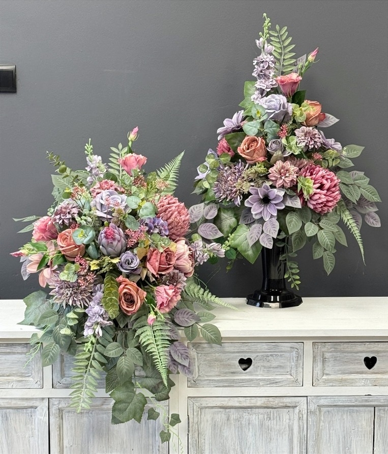 Seria Rawenna występuje w kilku wariantach kolorystycznych – od stonowanych, klasycznych po bardziej wyraziste odcienie. Dzięki temu z łatwością dopasujesz zestaw do pozostałych dekoracji z tej kolekcji lub do charakteru nagrobka. Kolorystyka utrzymana jest w eleganckim, zrównoważonym tonie, dzięki czemu kompozycje doskonale sprawdzą się przez cały rok.