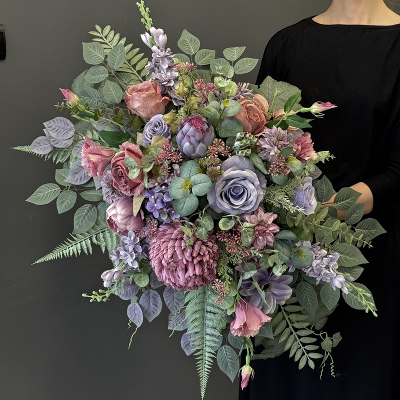 Każdy element zestawu został wykonany ręcznie z wysokiej jakości kwiatów sztucznych o realistycznym wyglądzie. Bukiet umieszczony jest w obciążonym, standardowym wkładzie do wazonu, co zapewnia stabilność nawet przy silniejszym wietrze. Na zdjęciach prezentujemy go w wazonie – wyłącznie w celu pokazania proporcji i wielkości kompozycji.