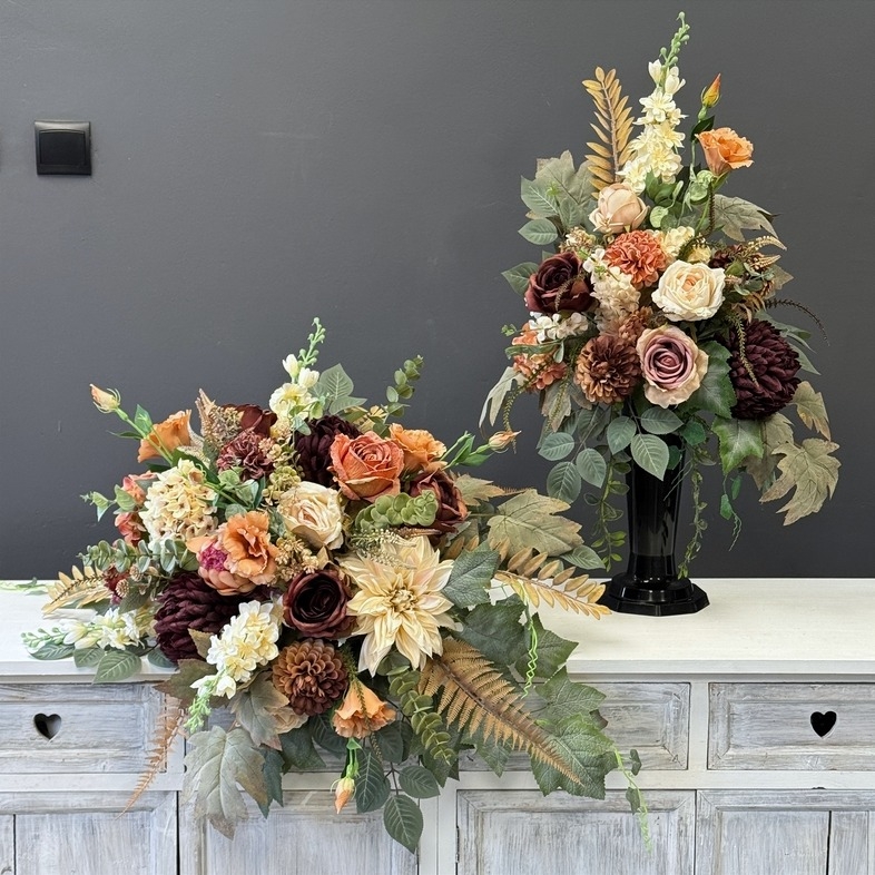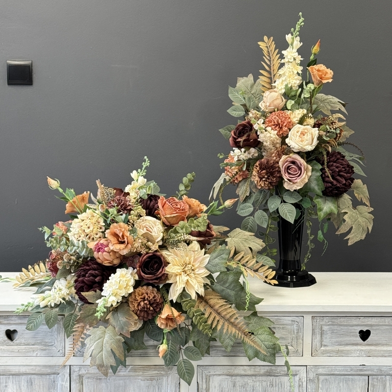 Seria Rawenna występuje w kilku wariantach kolorystycznych – od stonowanych, klasycznych po bardziej wyraziste odcienie. Dzięki temu z łatwością dopasujesz zestaw do pozostałych dekoracji z tej kolekcji lub do charakteru nagrobka. Kolorystyka utrzymana jest w eleganckim, zrównoważonym tonie, dzięki czemu kompozycje doskonale sprawdzą się przez cały rok.