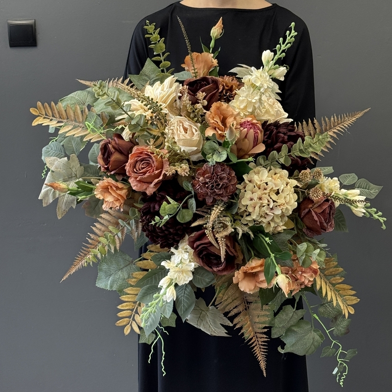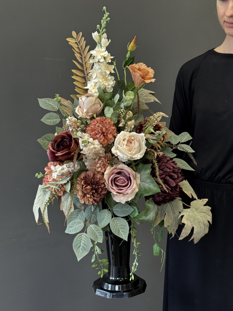 Każdy element zestawu został wykonany ręcznie z wysokiej jakości kwiatów sztucznych o realistycznym wyglądzie. Bukiet umieszczony jest w obciążonym, standardowym wkładzie do wazonu, co zapewnia stabilność nawet przy silniejszym wietrze. Na zdjęciach prezentujemy go w wazonie – wyłącznie w celu pokazania proporcji i wielkości kompozycji.