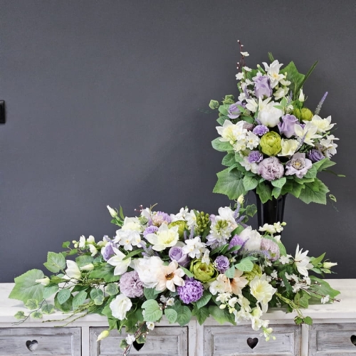 Komplet dekoracji nagrobnych składających się z kompozycji do położenia na płytę nagrobkową oraz bukietu umocowanego we wkładzie do wazonu.