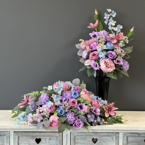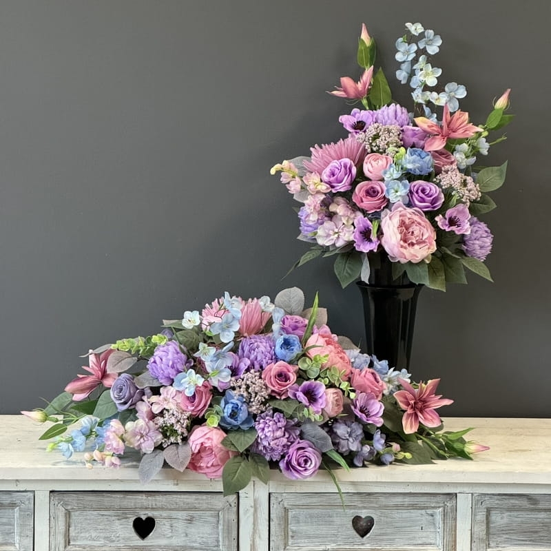 Komplet dekoracji nagrobnych składających się z kompozycji do położenia na płytę nagrobkową oraz bukietu umocowanego we wkładzie do wazonu.