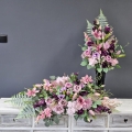 Komplet dekoracji nagrobnych składających się z kompozycji do położenia na płytę nagrobkową oraz bukietu umocowanego we wkładzie do wazonu.