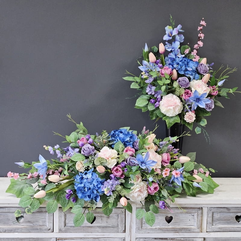 Komplet dekoracji nagrobnych składających się z kompozycji do położenia na płytę nagrobkową oraz bukietu umocowanego we wkładzie do wazonu.
