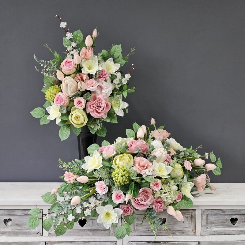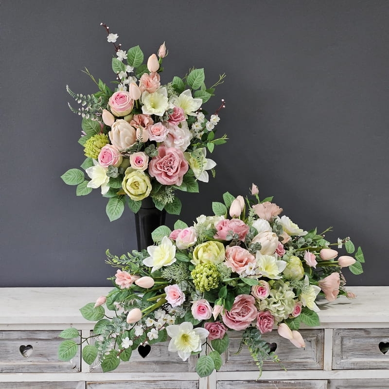 Komplet dekoracji nagrobnych składających się z kompozycji do położenia na płytę nagrobkową oraz bukietu umocowanego we wkładzie do wazonu.