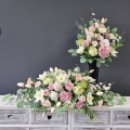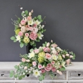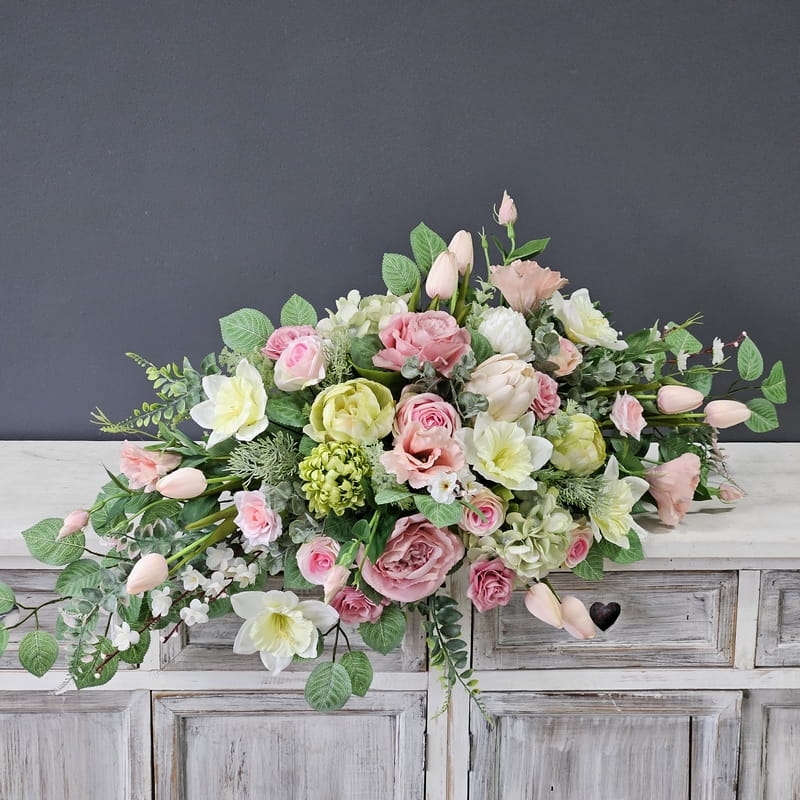 Postawa kompozycji wykonana z tworzywa sztucznego, dodatkowo obciążona cementem, wypełniona dużą ilością kwiatów, liści i roślinnych dodatków w przepięknej, stonowanej kolorystyce. Kompozycja ma kształt wrzeciona. Jest wydłużona obustronnie. Dominują kwiaty w stonowanej kolorystyce oraz liście w pastelowej zieleni. Poszczególne kompozycje mogą się różnić rozkładem i rodzajami kwiatów, w zależności od dostępności, jednak kolorystyka i efekt końcowy są zawsze zachowane.