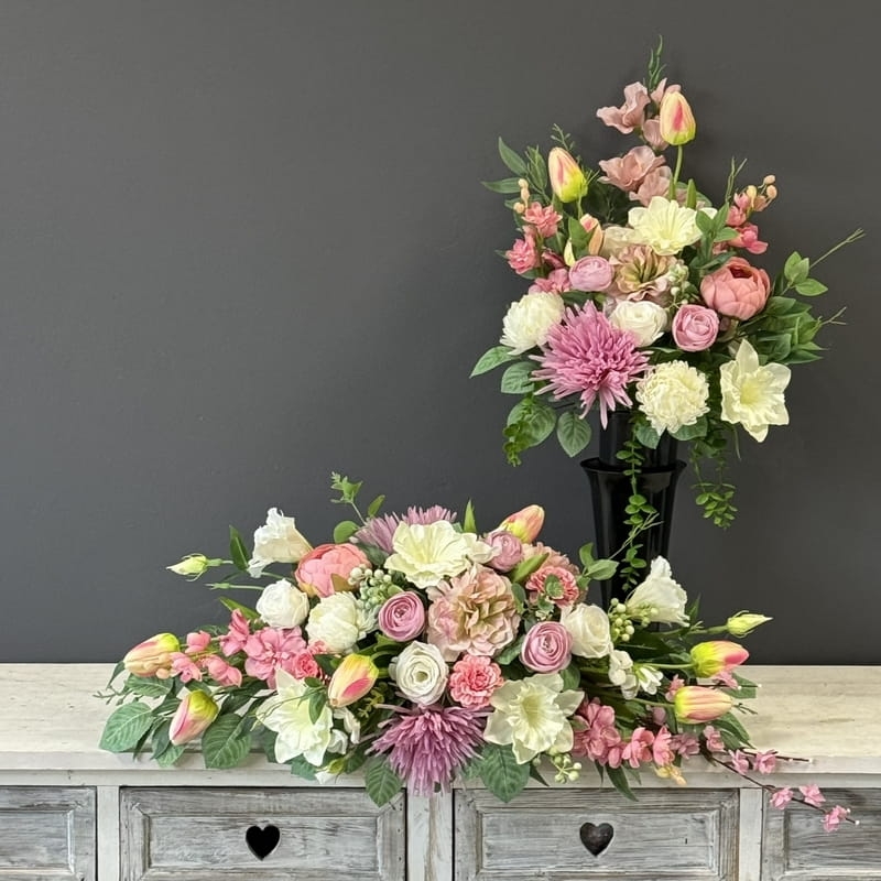 Komplet dekoracji nagrobnych składających się z kompozycji do położenia na płytę nagrobkową oraz bukietu umocowanego we wkładzie do wazonu.