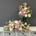 Postawa wykonana z tworzywa sztucznego, dodatkowo obciążona cementem, wypełniona dużą ilością kwiatów, liści i roślinnych dodatków w przepięknej, stonowanej kolorystyce. Kompozycja ma kształt wrzeciona. Jest wydłużona obustronnie. Dominują kwiaty w stonowanej kolorystyce oraz liście w pastelowej zieleni. Poszczególne kompozycje mogą się różnić rozkładem i rodzajami kwiatów, w zależności od dostępności, jednak kolorystyka i efekt końcowy są zawsze zachowane.