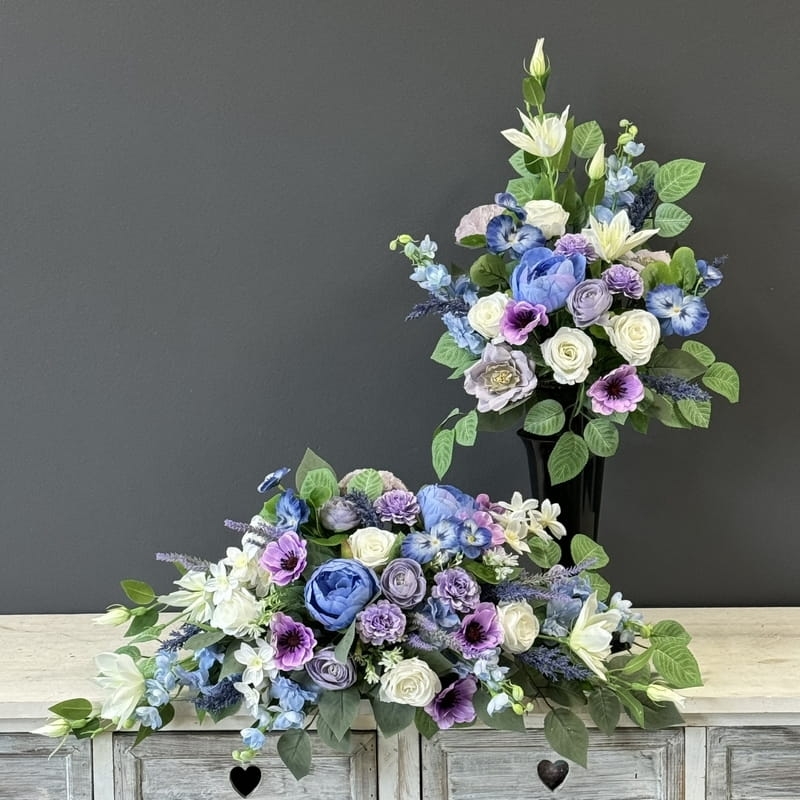 Komplet dekoracji nagrobnych składających się z kompozycji do położenia na płytę nagrobkową oraz bukietu umocowanego we wkładzie do wazonu.