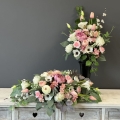 Komplet dekoracji nagrobnych składających się z kompozycji do położenia na płytę nagrobkową oraz bukietu umocowanego we wkładzie do wazonu.