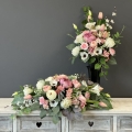Postawa wykonana z tworzywa sztucznego, dodatkowo obciążona cementem, wypełniona dużą ilością kwiatów, liści i roślinnych dodatków w przepięknej, stonowanej kolorystyce. Kompozycja ma kształt wrzeciona. Jest wydłużona obustronnie. Dominują kwiaty w stonowanej kolorystyce oraz liście w pastelowej zieleni. Poszczególne kompozycje mogą się różnić rozkładem i rodzajami kwiatów, w zależności od dostępności, jednak kolorystyka i efekt końcowy są zawsze zachowane.
