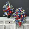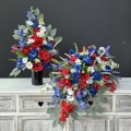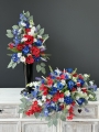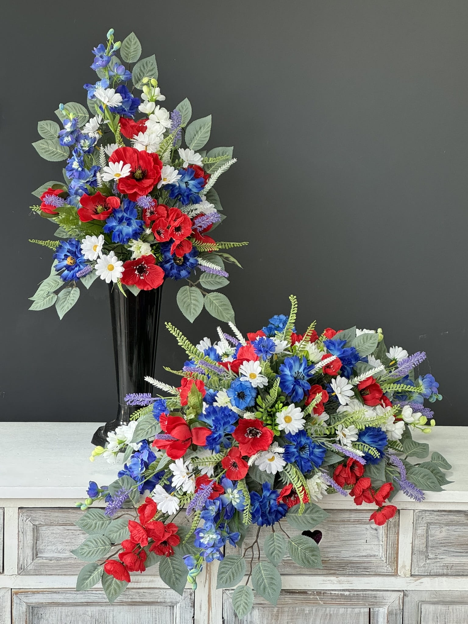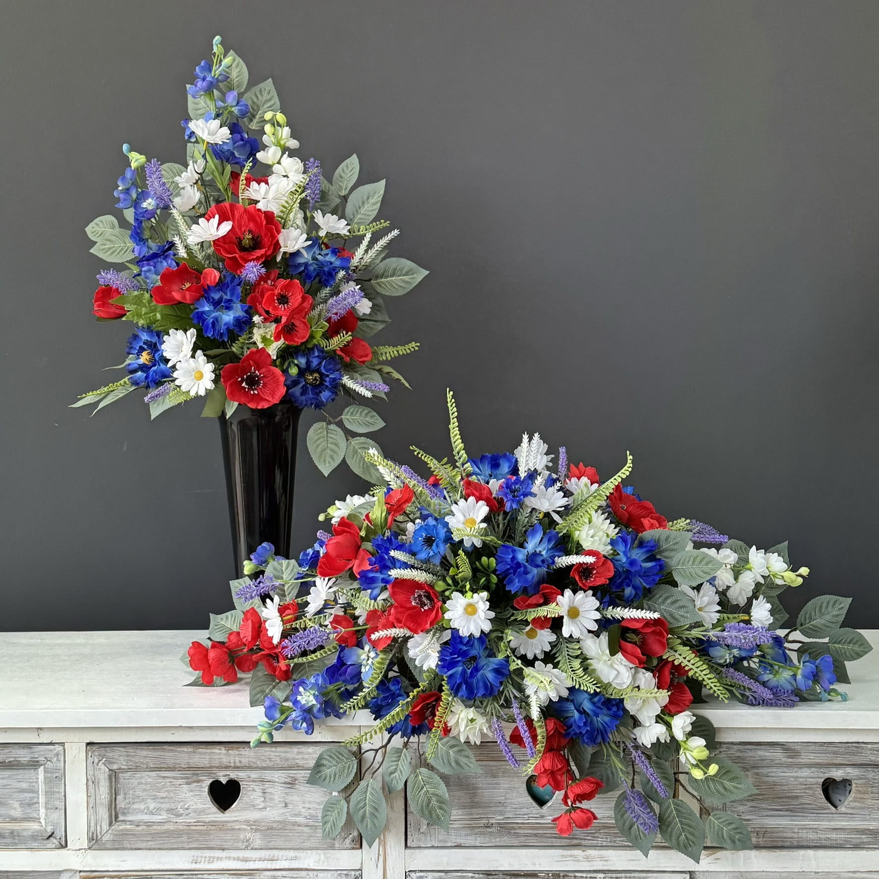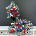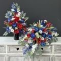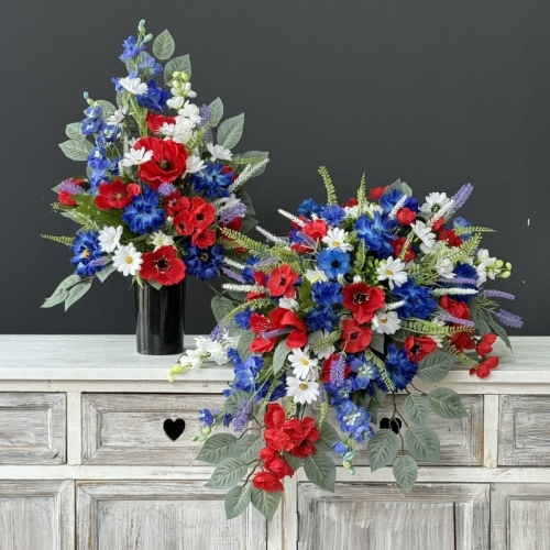 Komplet dekoracji nagrobnych składających się z kompozycji do położenia na płytę nagrobkową oraz bukietu umocowanego we wkładzie do wazonu.