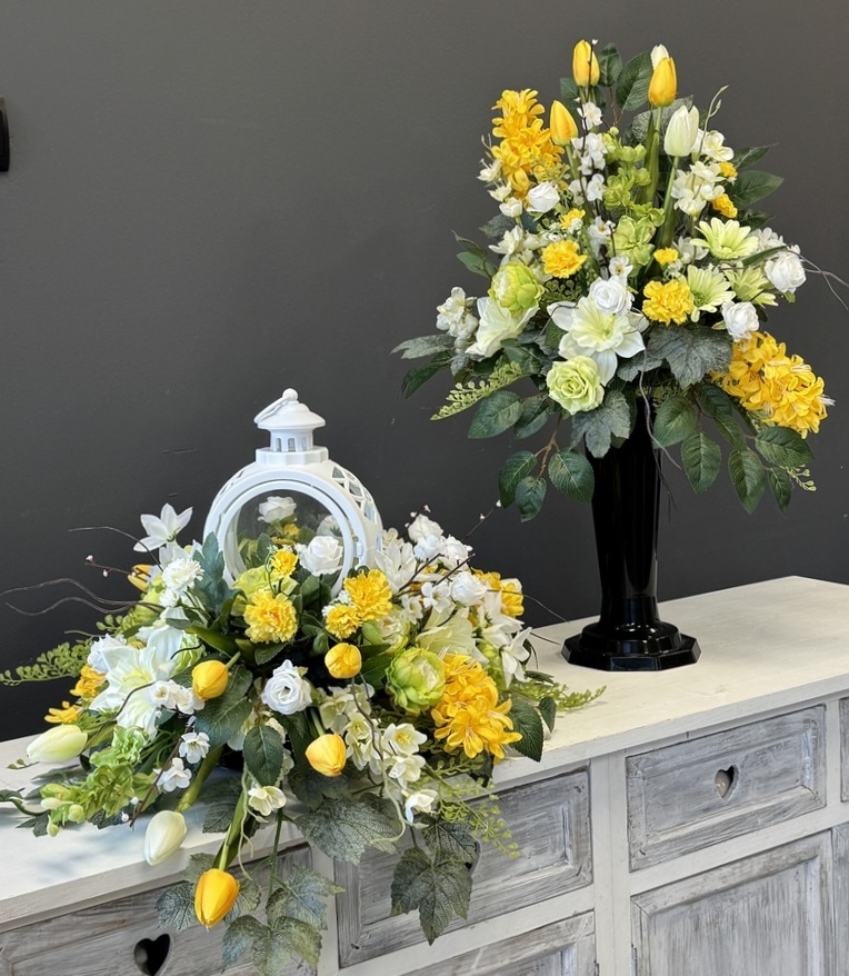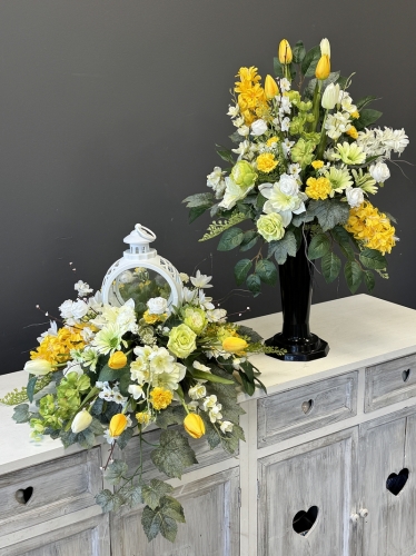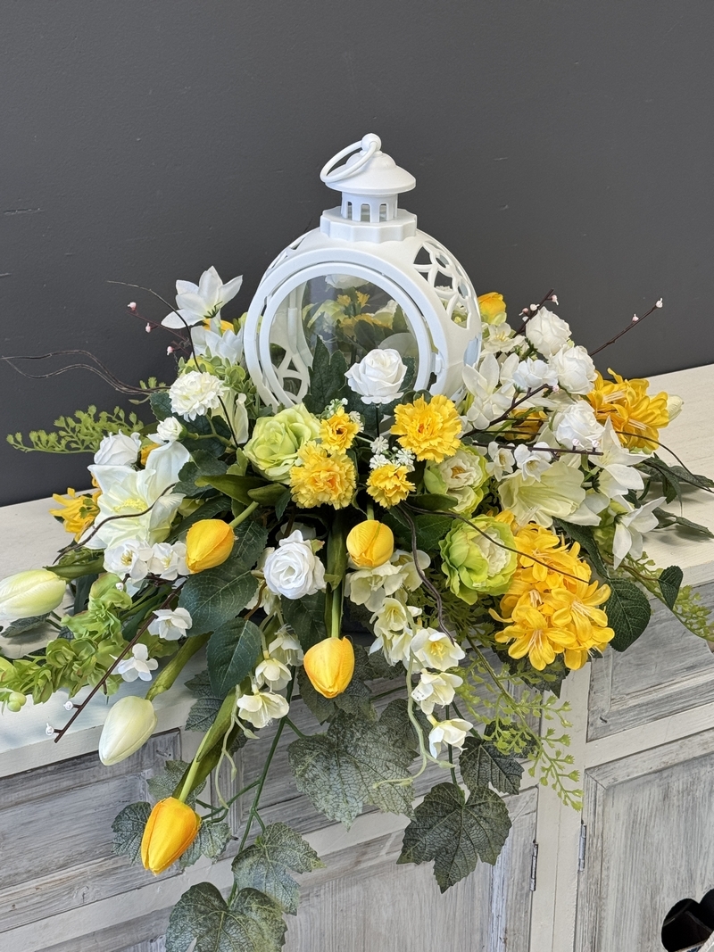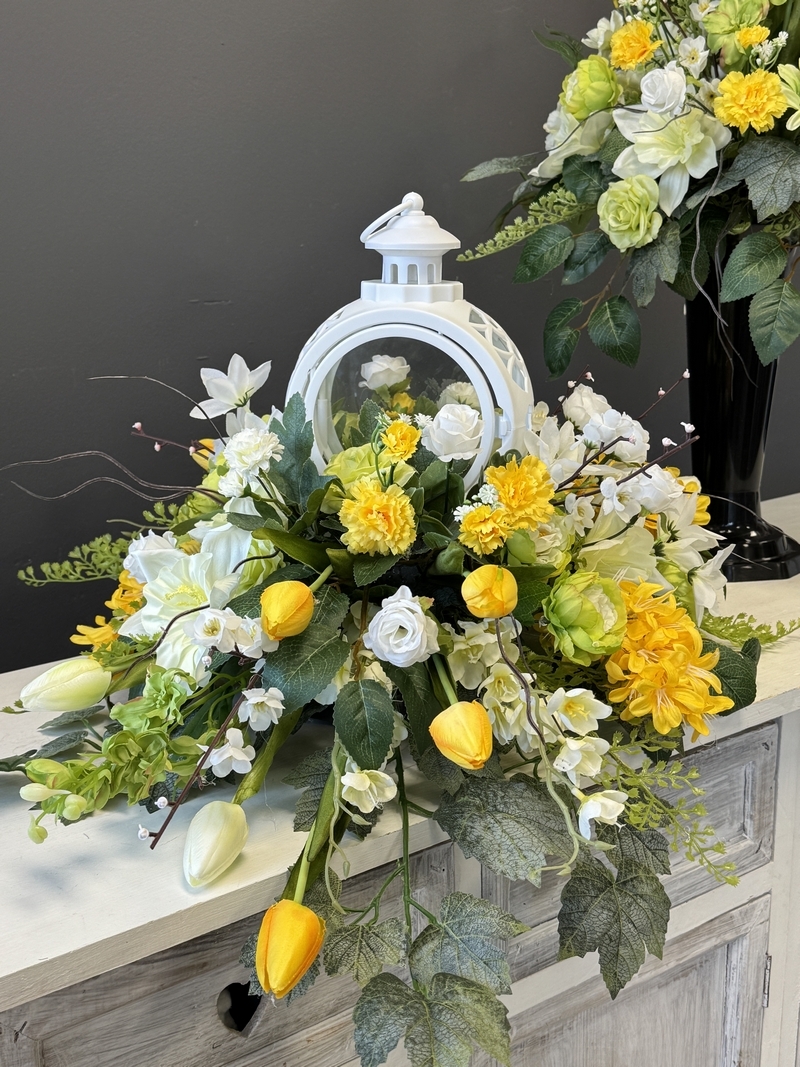 Elegancki zestaw kompozycji nagrobnych z latarenką i bukietem do wazonu, który tworzy spójną i wyjątkowo dekoracyjną aranżację miejsca pamięci. Kompozycja utrzymana jest w świeżej, wiosennej kolorystyce żółci, bieli i delikatnej zieleni, dzięki czemu całość prezentuje się bardzo naturalnie i elegancko.